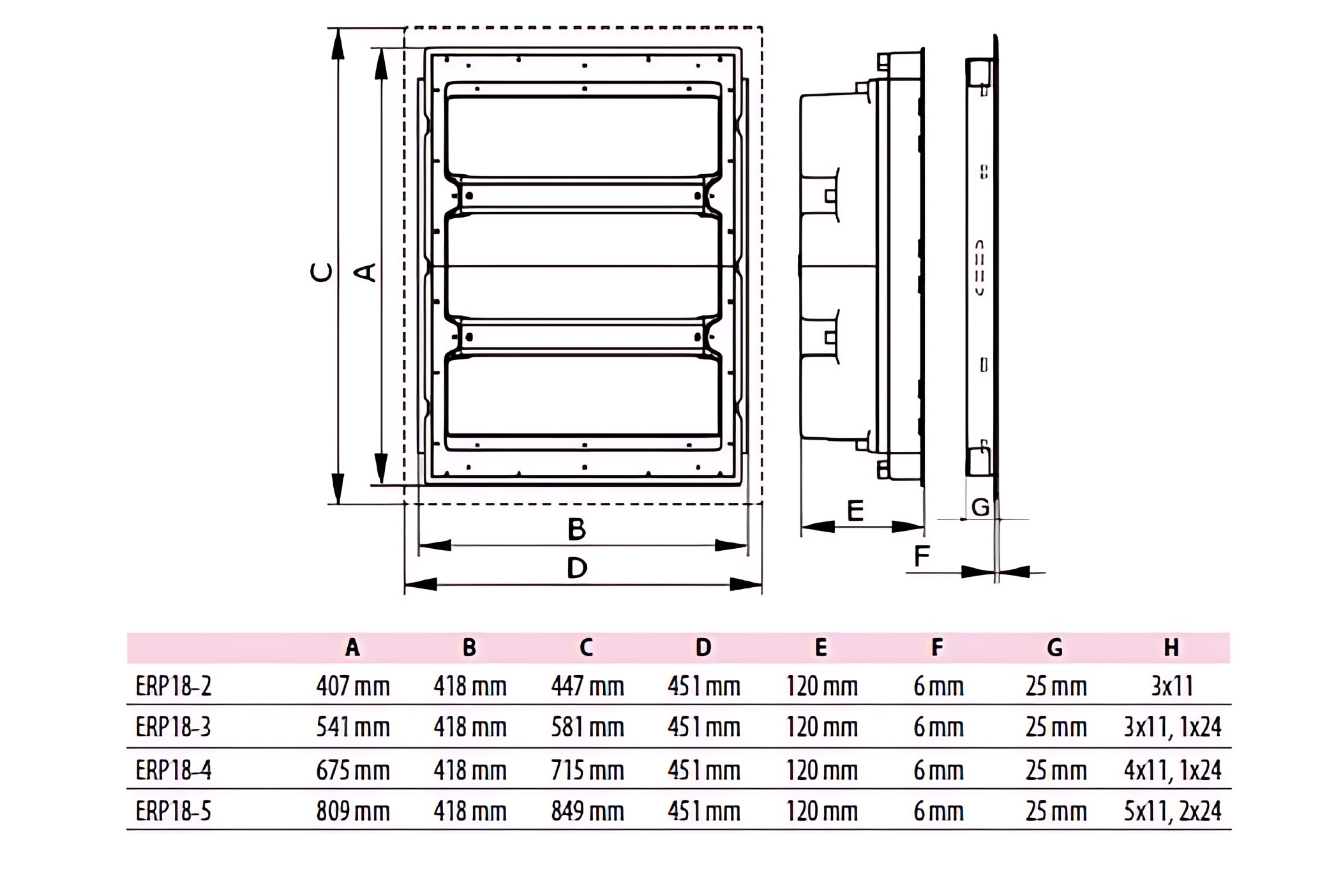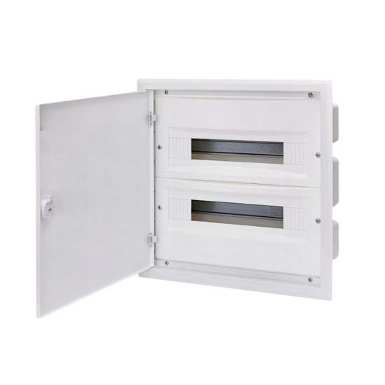 Rozdzielnica modułowa wykonana z tworzywa sztucznego, przeznaczona do montażu podtynkowego. Posiada 2 rzędy po 18 modułów.