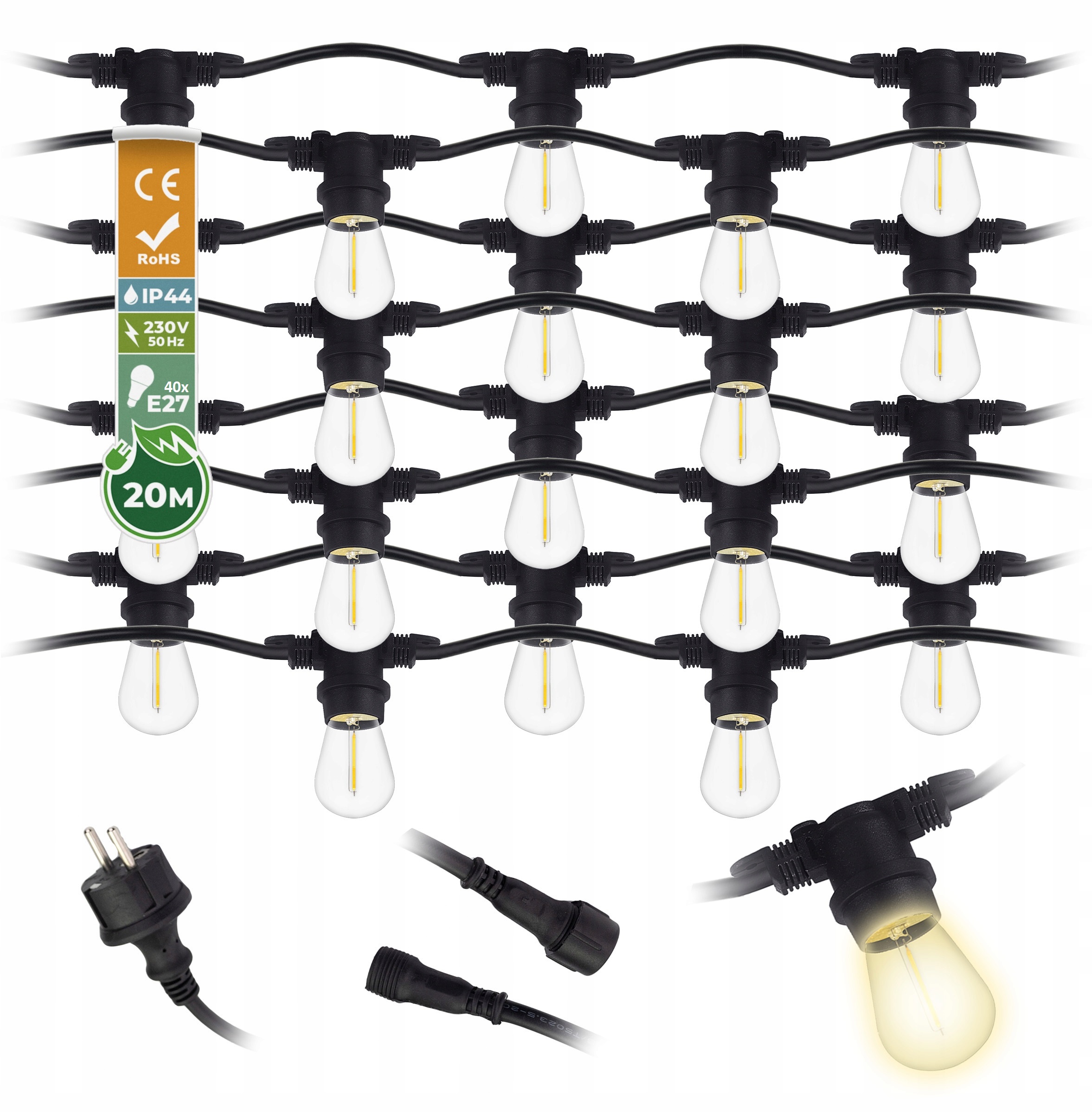 Girlanda o długości 20 metrów wyposażona w 40 żarówek LED E27 Filament (+1 w gratisie). Girlanda żarówkowa z możliwością stosowania w projektach wewnętrznych i zewnętrznych – klasa szczelności IP44.