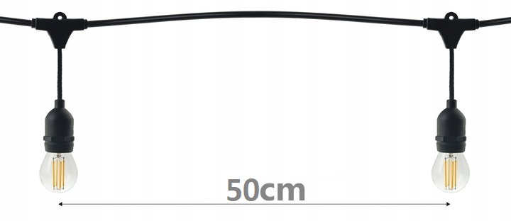 Oferowana girlanda ma długość 20 metrów i została wyposażona w 40 żarówek LED z dużym gwintem o mocy 1W każda (Barwa: Biała Ciepła 3000K). Odstęp między kolejnymi żarówkami w girlandzie wynosi 50 cm.
