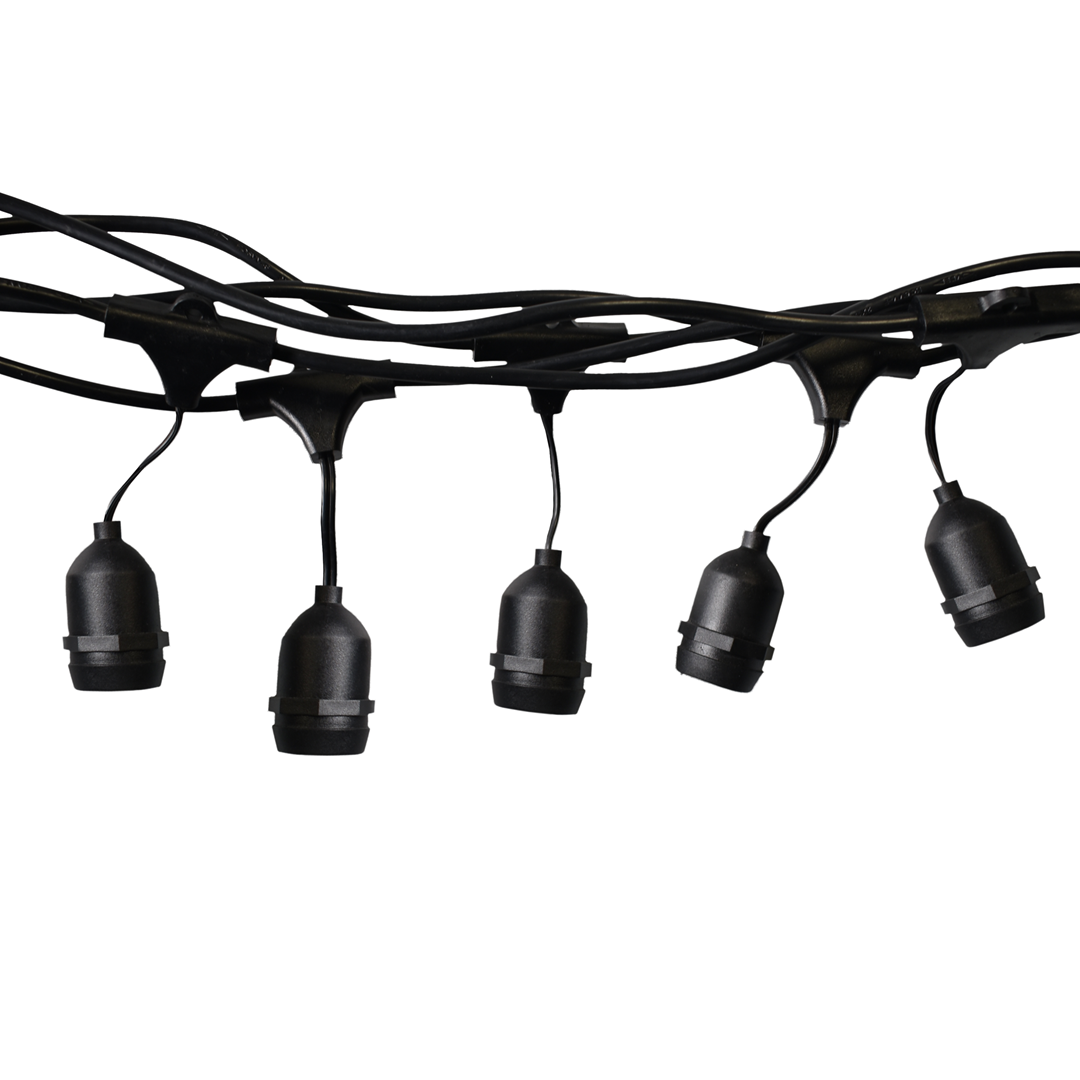 Girlanda zewnętrzna o długości 10 metrów wyposażona w 20 gniazd przeznaczonych do żarówek E27. Girlanda żarówkowa z możliwością stosowania w aranżacjach wewnętrznych i zewnętrznych – klasa szczelności IP65.
