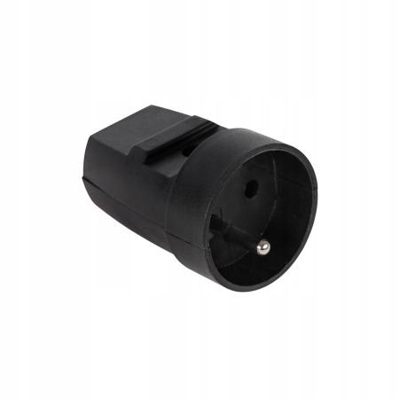 Czarne gniazdo przenośne z uziemieniem do użytku domowego i podobnego wewnątrz oraz na zewnątrz budynków. Gniazdo przeznaczone do montażu na kabel elektryczny.