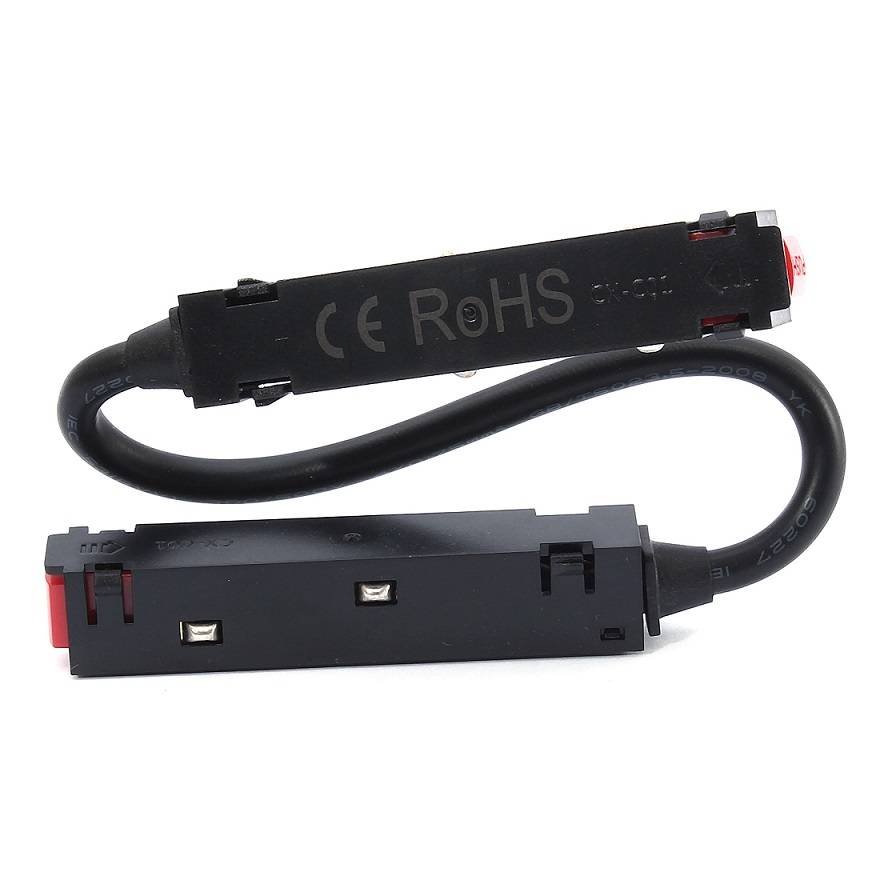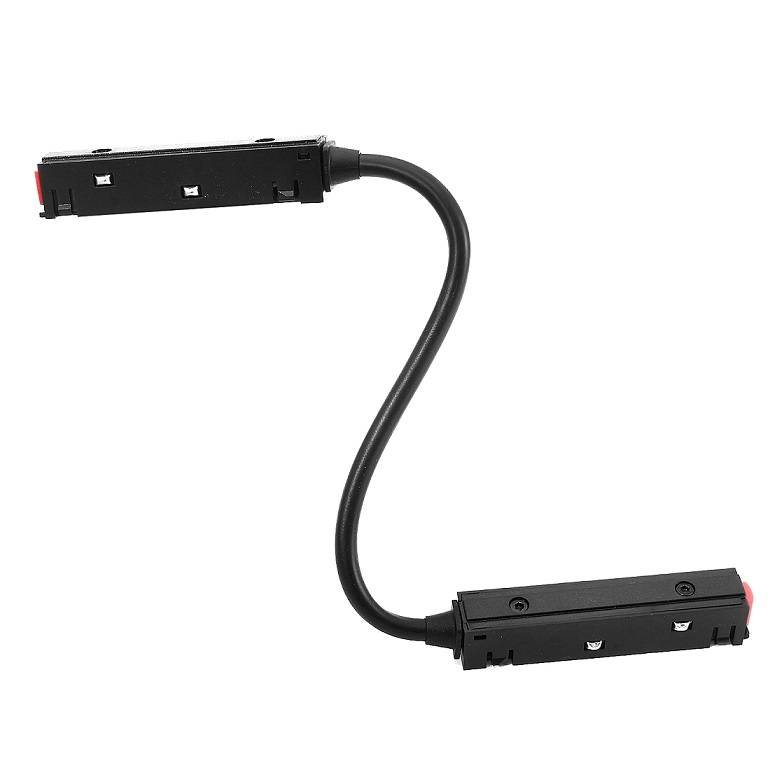 Łącznik kątowy z kablem w czarnym kolorze przeznaczony do szynoprzewodów magnetycznych z serii Black Line. Łącznik elastyczny zapewnia połączenie elektryczne pomiędzy dwoma szynami magnetycznymi. Przeznaczony jest do szynoprzewodów natynkowych, podtynkowych i wpuszczanych oraz pozwala na łączenie ich pod dowolnym kątem.