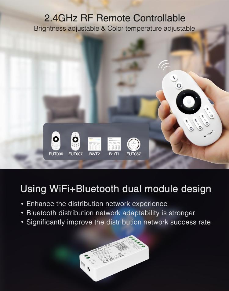 Odbiornik LED w połączeniu z pilotem, sterownikiem naściennym lub aplikacją na smartfona pozwala na sterowanie taśmami LED CCT o zmiennej barwie bieli. Jego możliwości to:
