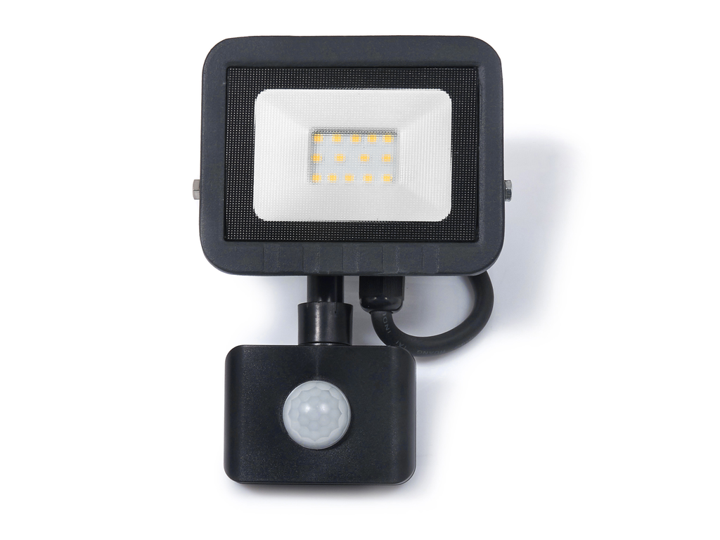 Naświetlacz LED Expert z czujnikiem ruchu i zmierzchu o mocy 10W. Biała zimna barwa światła 6000-6500K. Halogen zewnętrzny w czarnej obudowie, z klasą szczelności IP65.