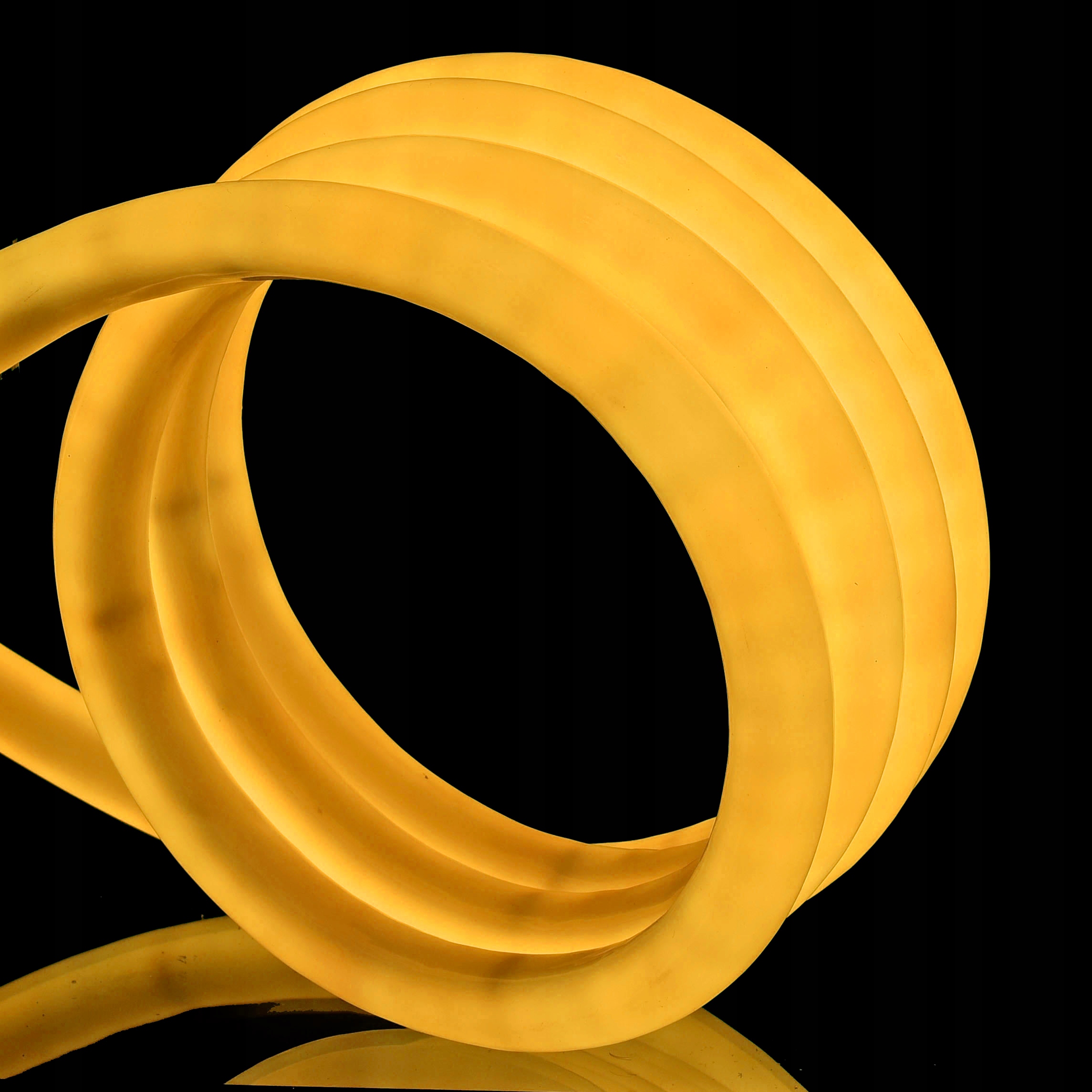 Profesjonalny NEON flex LED 16mm 360° Złoty Żółty 24V marki LED EXPERT to elastyczny wąż świetlny wykonany z wysokiej jakości tworzywa PVC, przeznaczony do efektownego oświetlenia wnętrz i przestrzeni zewnętrznych. Dzięki okrągłej konstrukcji świeci równomiernie w pełnych 360°, tworząc jednolitą, estetyczną poświatę widoczną z każdej strony. Mleczna powłoka zapewnia delikatne rozproszenie światła, a intensywny żółty kolor dodaje przestrzeni nowoczesnego, wyrazistego charakteru. Technologia LED gwarantuje niskie zużycie energii i długą, stabilną pracę.
