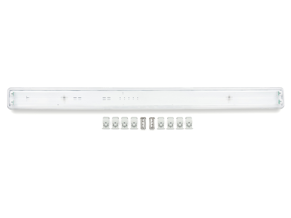 Oprawa hermetyczna przeznaczona jest do świetlówek LED zasilanych jednostronnie. Oznacza to, że możemy podłączyć do niej najpopularniejsze świetlówki LED na rynku, w których zasilanie podłącza się do jednego gniazda, a drugie stanowi wyłącznie uchwyt świetlówki.