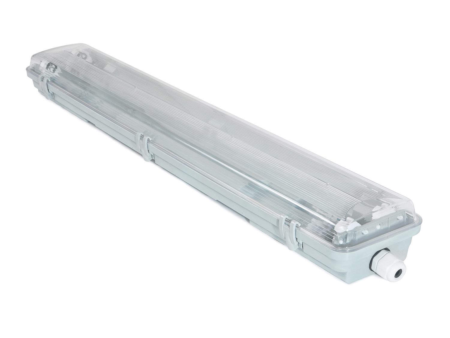 Zestaw: oprawa hermetyczna IP65 2×60 cm w komplecie z dwiema świetlówkami LED o mocy 9W każda (2×800 lumenów) i białej neutralnej barwie światła. Lampa świetlówkowa przeznaczona do oświetlenia garaży, warsztatów i obiektów przemysłowych.