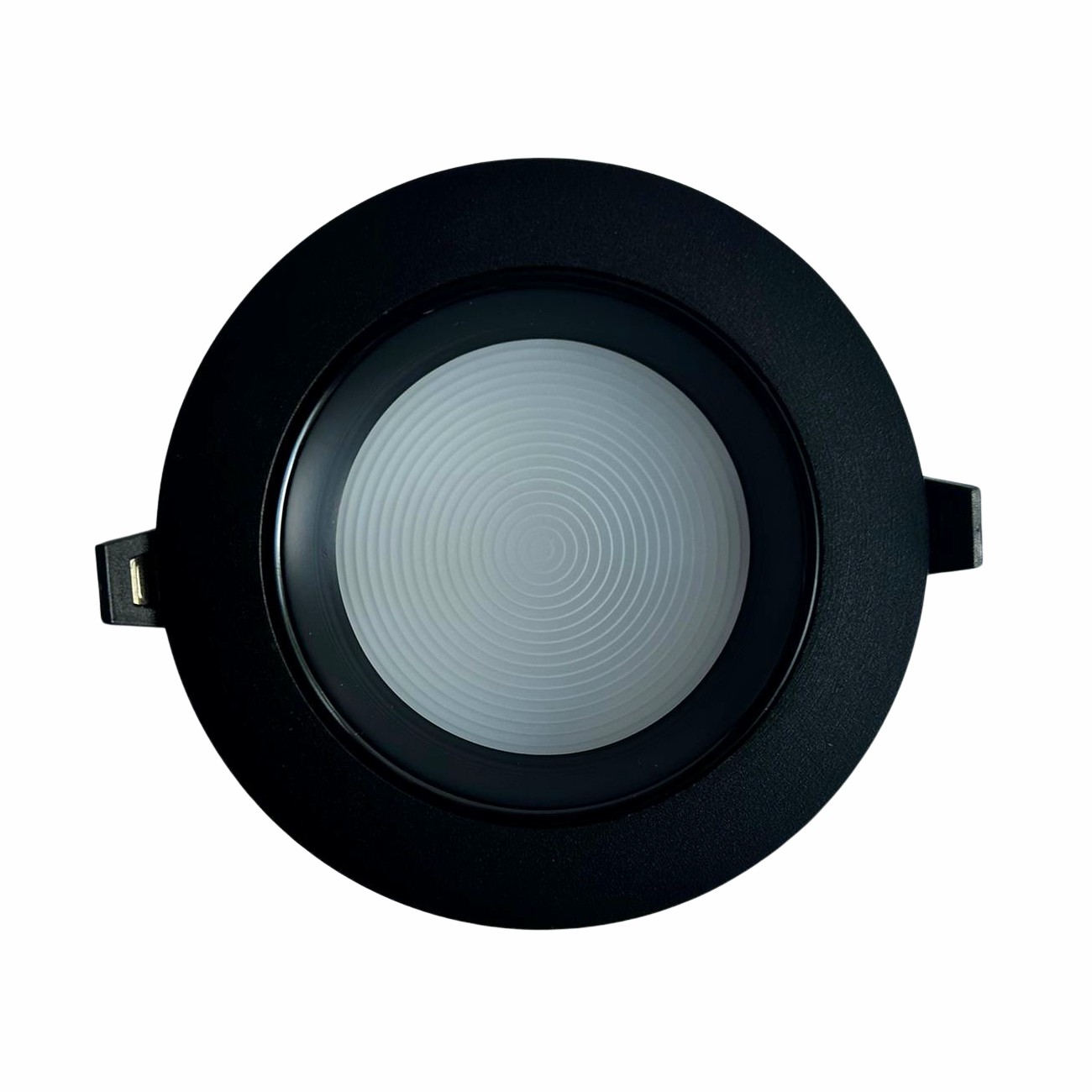Oprawa LED Downlight czarna o mocy 12W, oferująca białe neutralne światło o sile 960 lumenów. Panel LED z czarną ramką i mlecznym kloszem ze strukturą koncentrycznych pierścieni, przeznaczony do montażu w sufitach podwieszanych. Lampa wyposażona w zintegrowany układ zasilający, pozwalający na instalację bezpośrednio do prądu 230V.