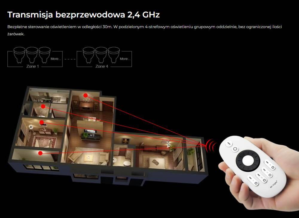 Podstawą działania pilota FUT006 jest bezprzewodowa komunikacja radiowa, która zapewnia wygodne i niezawodne sterowanie oświetleniem bez konieczności prowadzenia dodatkowego okablowania. Pilot Mi-Light FUT006 komunikuje się z kompatybilnymi odbiornikami w paśmie 2,4 GHz, które jest powszechnie wykorzystywane w nowoczesnych systemach sterowania oświetleniem. Rozwiązanie to zapewnia stabilne połączenie, prostą konfigurację oraz zasięg pracy do 30 metrów, dzięki czemu pilot sprawdza się zarówno w mniejszych, jak i bardziej rozbudowanych instalacjach LED.