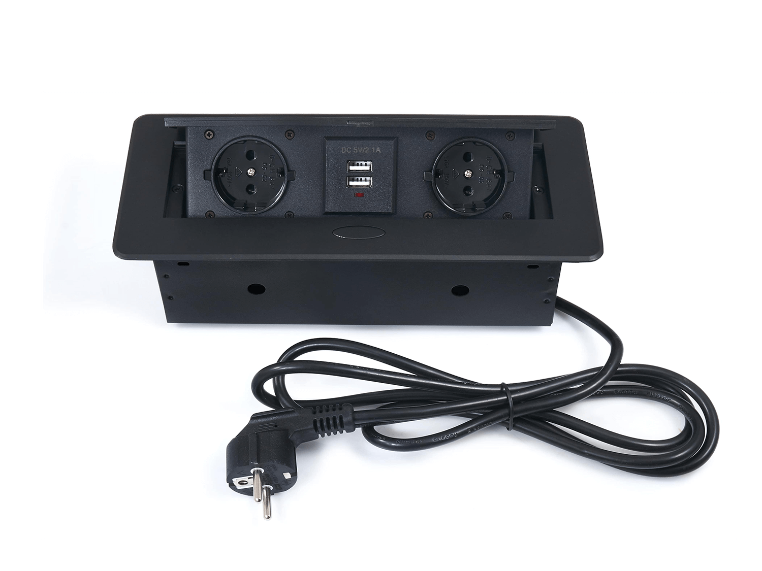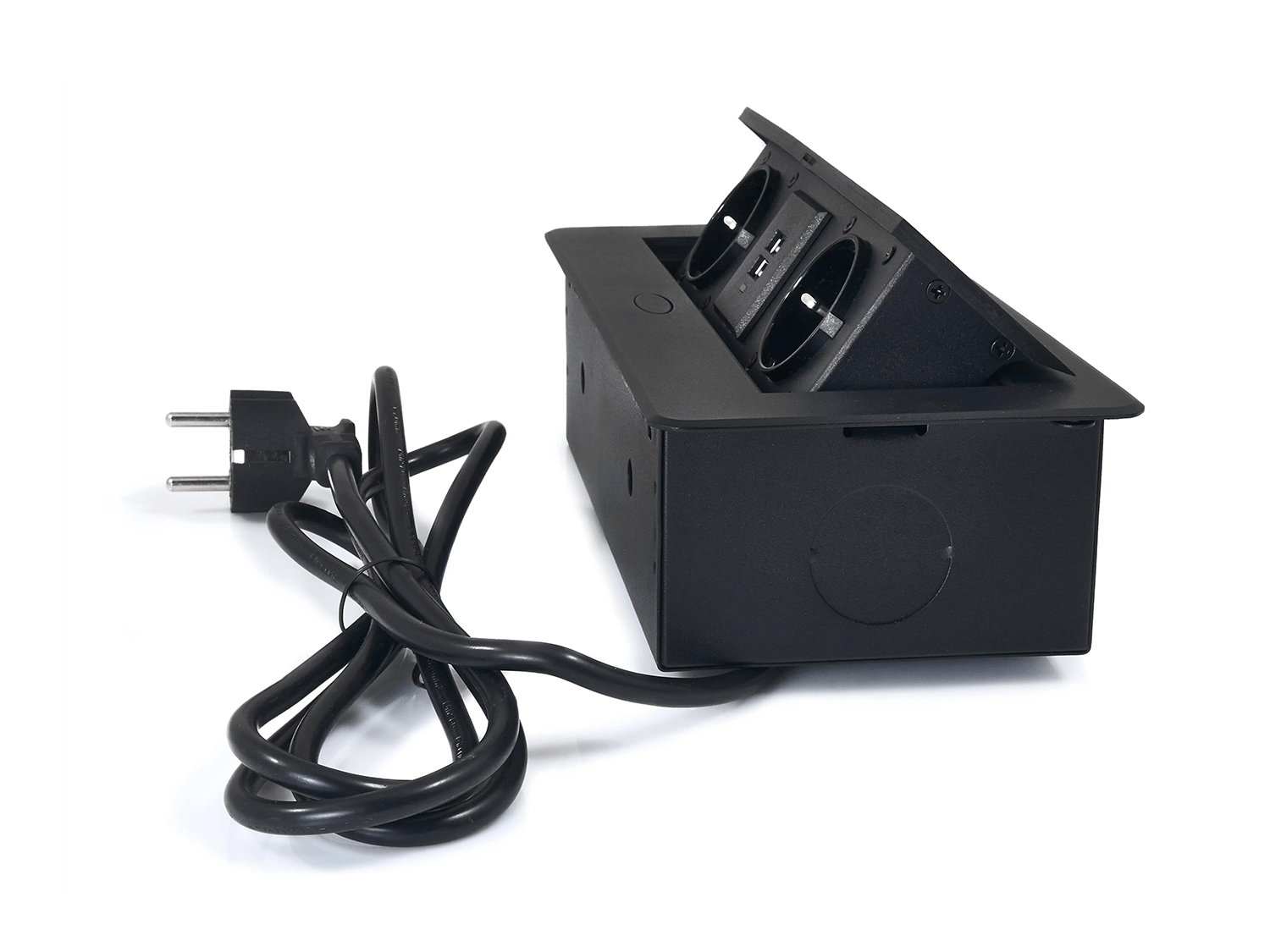 Czarny Power Port biurkowy z dwoma gniazdami sieciowy 230V, wyposażony w dwa porty USB 2.1. Przeznaczony do zasilania i ładownia urządzeń elektrycznych, jak i transferu danych poprzez USB.