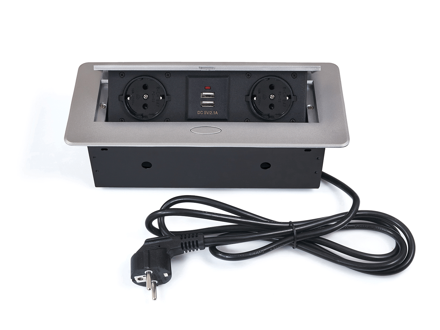 Srebrny Power Port biurkowy z dwoma gniazdami sieciowy 230V, wyposażony w dwa porty USB 2.1. Przeznaczony do zasilania i ładownia urządzeń elektrycznych, jak i transferu danych poprzez USB.