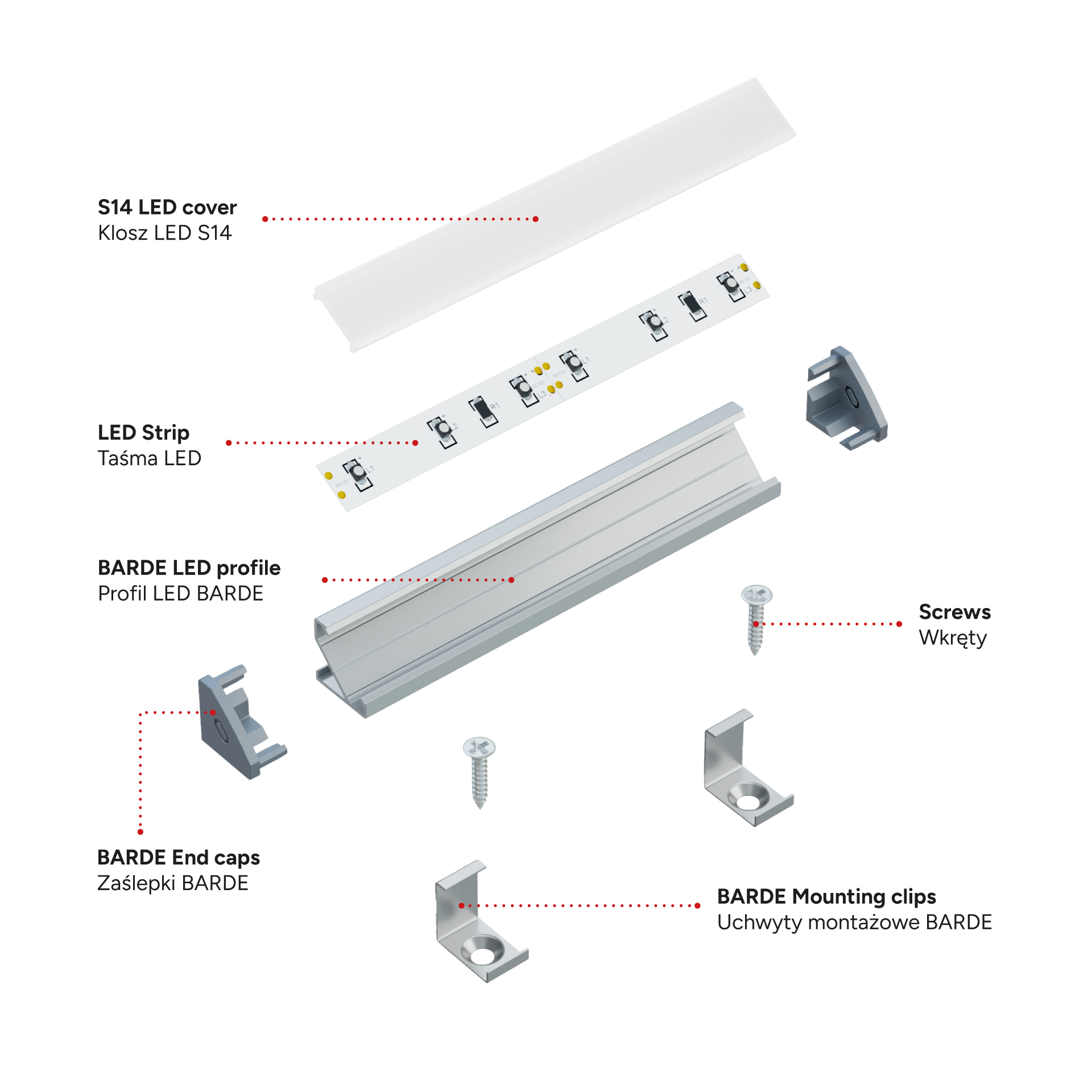 Zestaw zawiera: 1 x Profil LED BARDE, 1 x Klosz LED S14, 4 x Zaślepka BARDE, 4 x Uchwyt montażowy BARDE