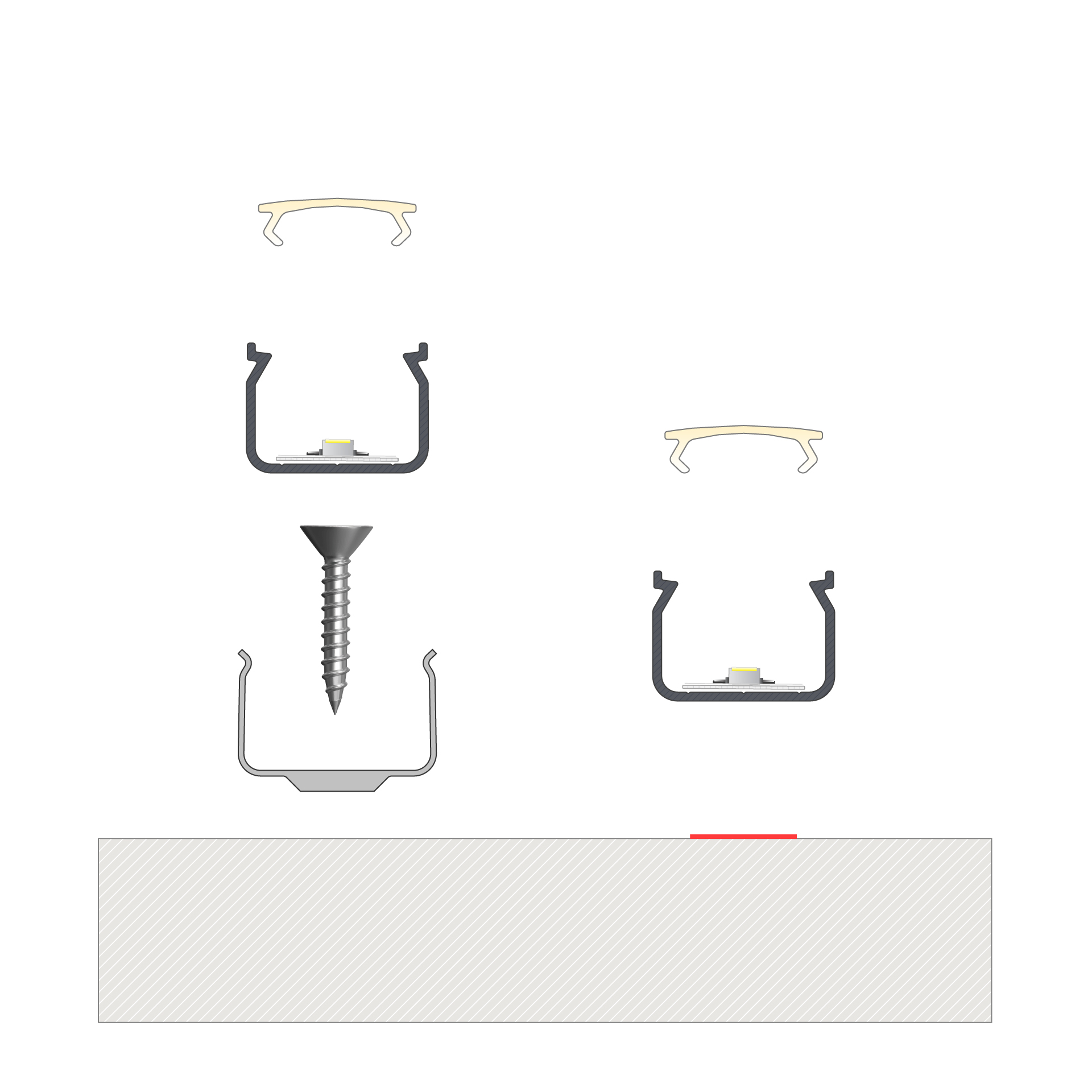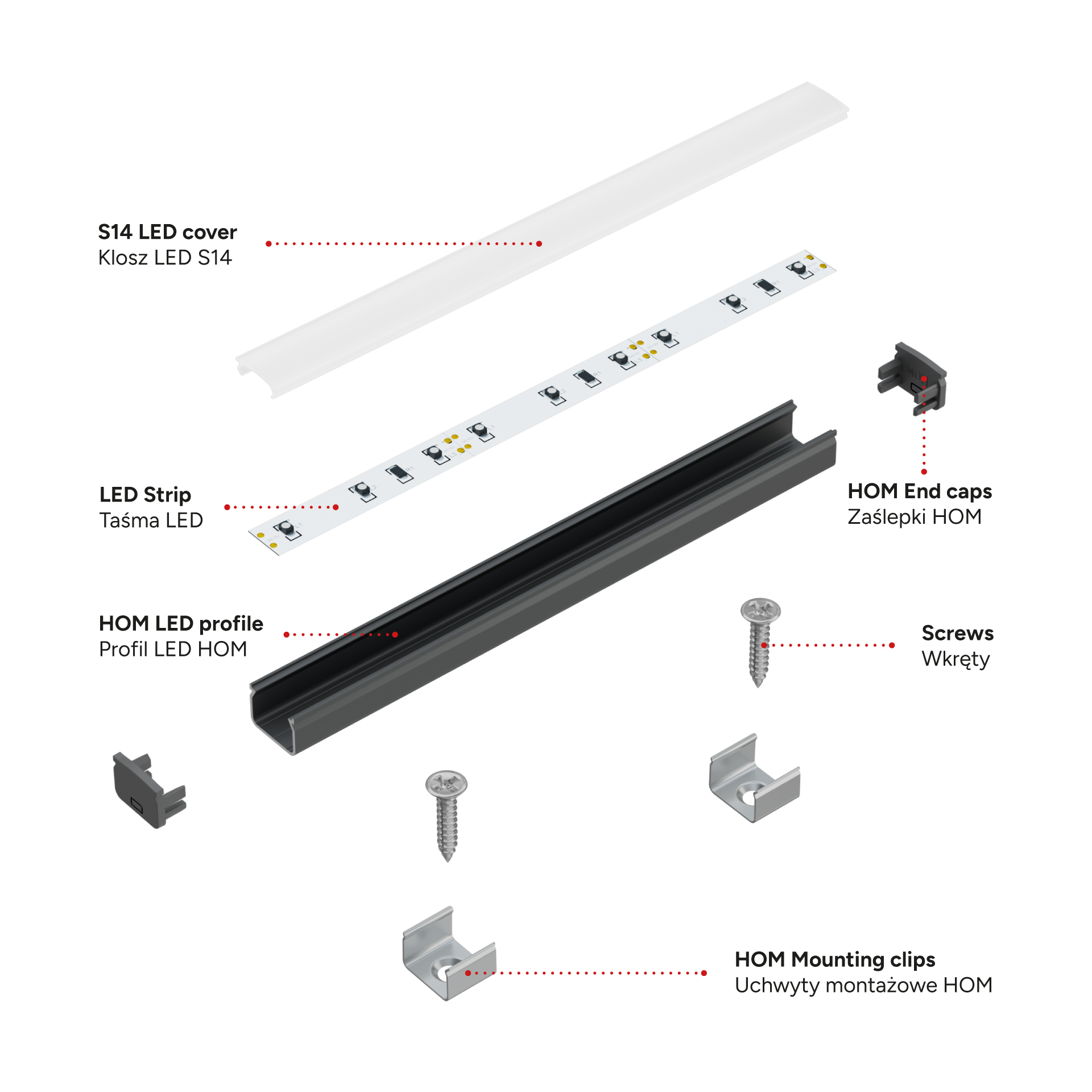 Zestaw zawiera: 1 x Profil LED HOM, 1 x Klosz LED S14, 4 x Zaślepka HOM, 4 x Uchwyt montażowy HOM