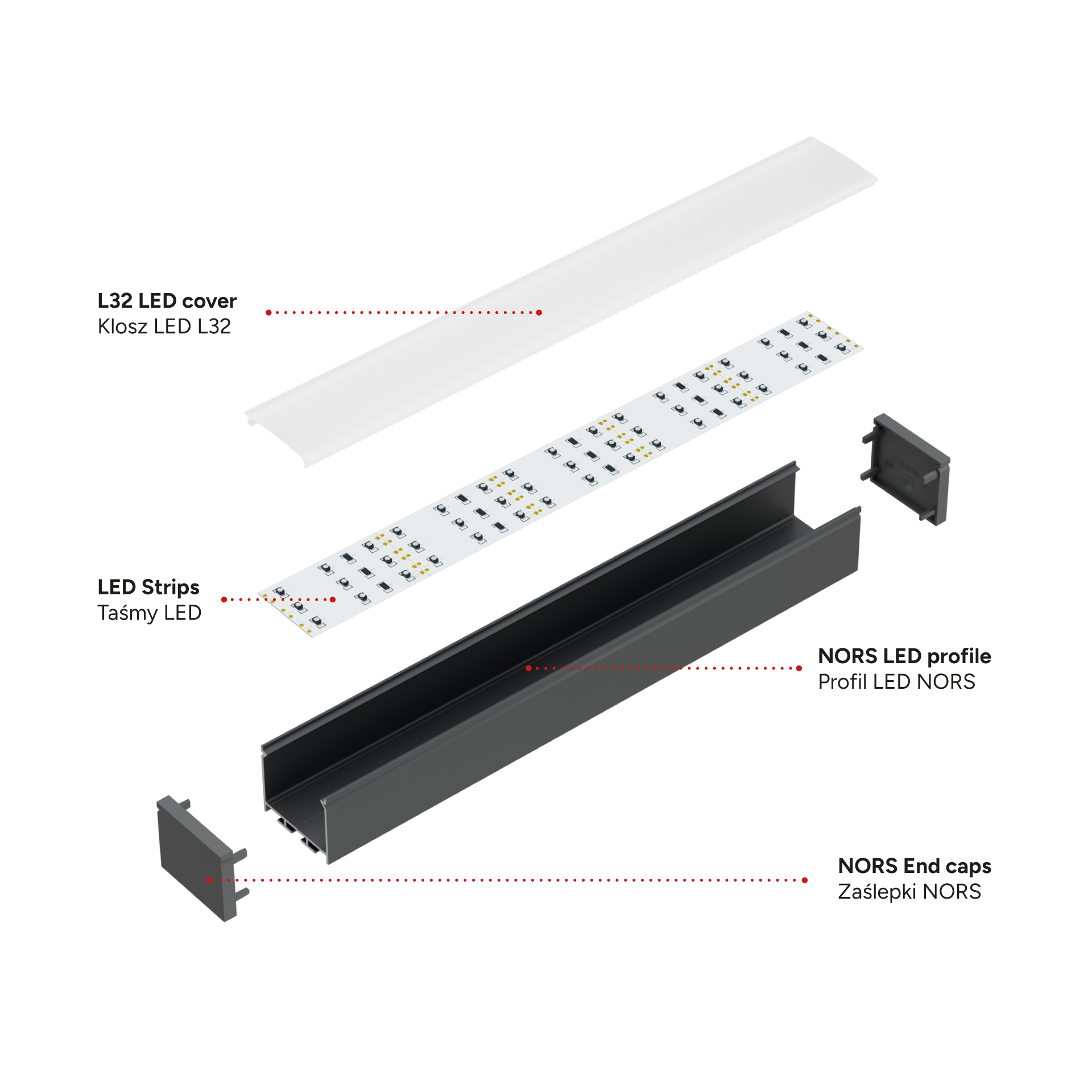 Zestaw zawiera: 1 x Profil LED NORS, 1 x Klosz LED L32, 4 x Zaślepka NORS