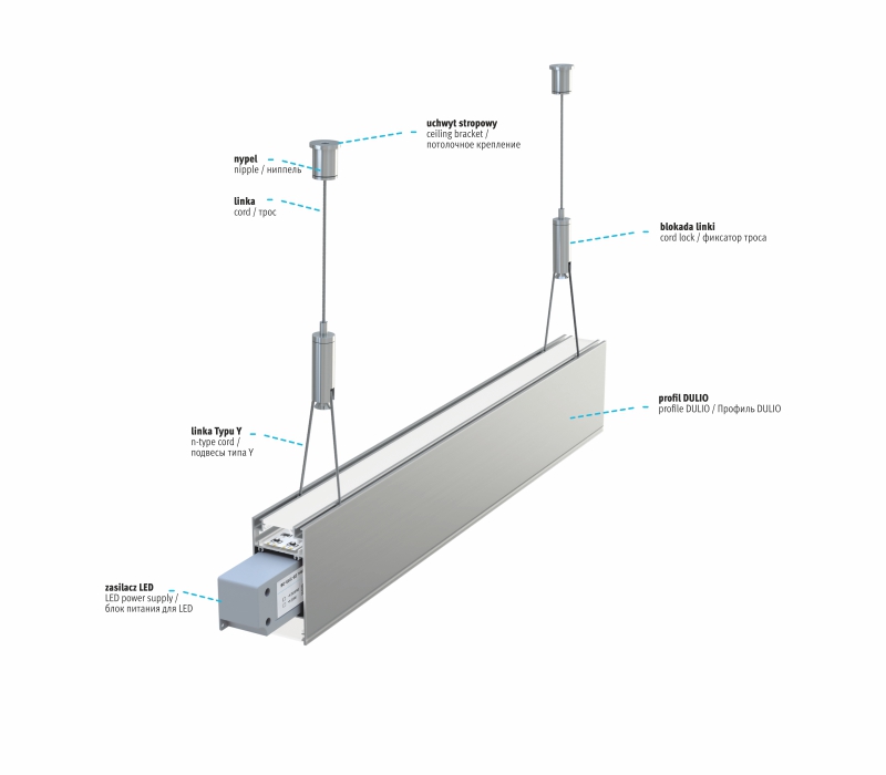 Instrukcja montażu profilu DULIO z ukrytym zasilaczem przy wykorzystaniu zawiesi Typu Y wraz z kloszem WIDE oraz kloszem DOUBLE