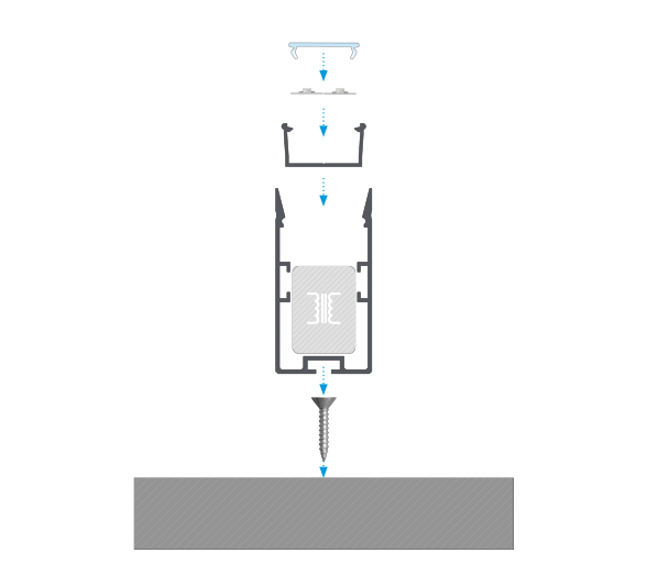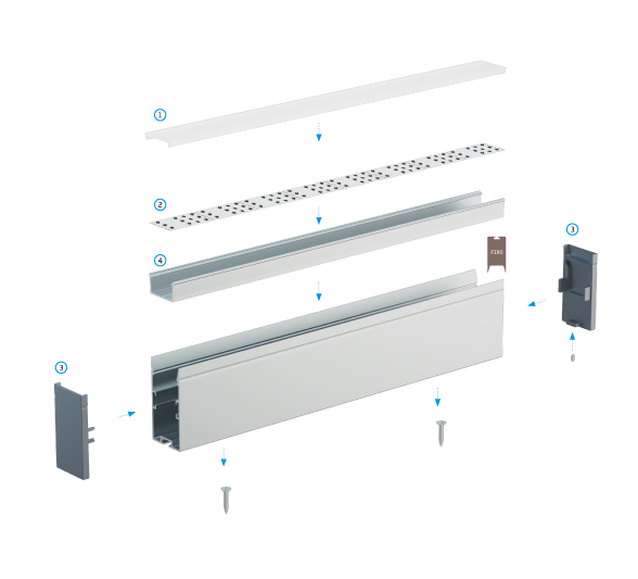 Schemat złożenia elementów systemu oświetleniowego z wykorzystaniem profilu FIXO,  klosza DOUBLE, taśmy LED, profilu montażowego FIXO M1, zaślepek