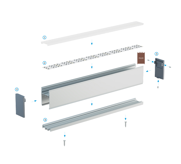 Schemat złożenia elementów systemu oświetleniowego z wykorzystaniem profilu FOLDO,  klosza WIDE, taśmy LED, profilu montażowego FOLDO M1, zaślepek