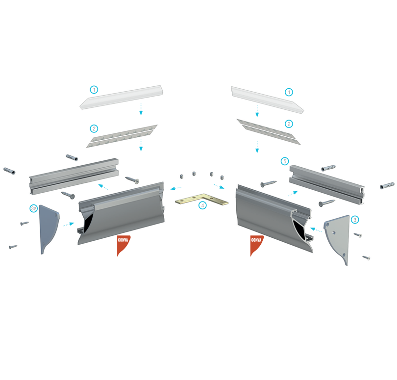 Schemat złożenia elementów systemu oświetleniowego z wykorzystaniem profilu CONVA, (1) klosza DOUBLE, (2) taśmy LED, (3) zaślepki CONVA z otworem, (3a) zaślepki CONVA bez otworu, (4) łącznika kątowego, (5) profilu montażowego SPARO.