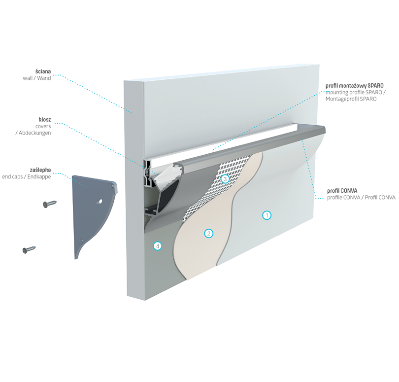 Przedstawienie etapów montażu naściennego z wykorzystaniem profilu CONVA [1. farba, 2. gips, 3. siatka, 4. płyta kartonowo- gipsowa].