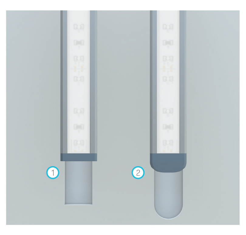 Rzut aksonometryczny przed montażem profilu B wewnątrz wyfrezowanego otworu (1) z zaślepką płaską, (2) z zaślepką okrągłą
