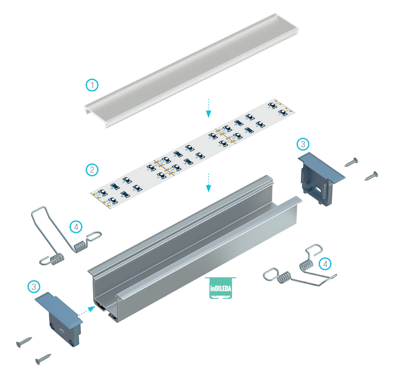 Schemat złożenia elementów systemu oświetleniowego z wykorzystaniem profilu inDILEDA oraz (1) klosza DOUBLE, (2) taśm LED, (3) zaślepek z otworem, oraz (4) sprężyn montażowych.