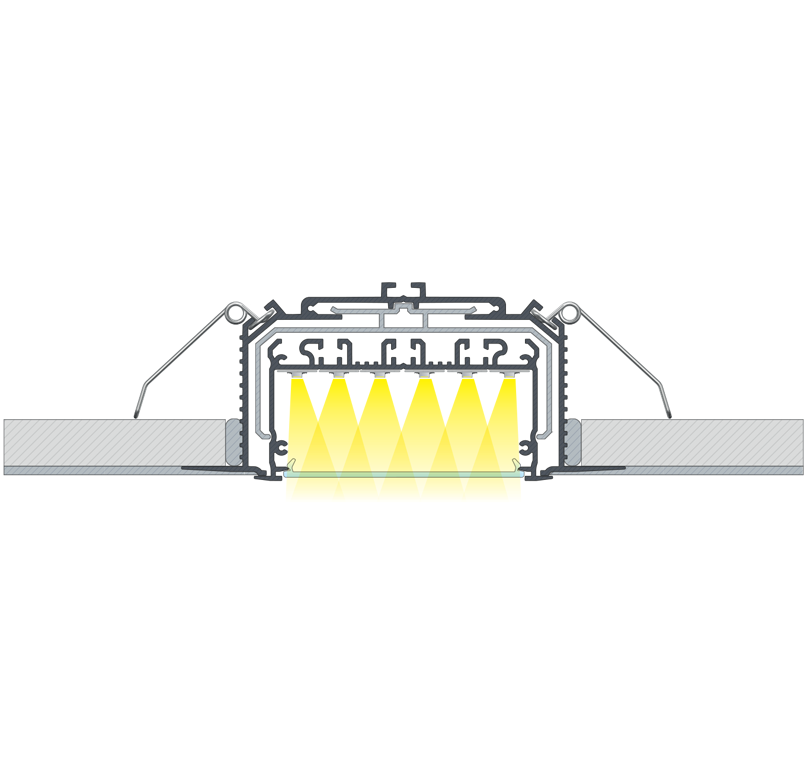 Efekt końcowy montażu systemu profilu inLARGO z kloszem SUPER WIDE, łącznikiem międzyprofilowym LARGO, profilem montażowym LARGO M3 wraz ze sprężynami montażowymi z zagipsowanym fragmentem profilu.