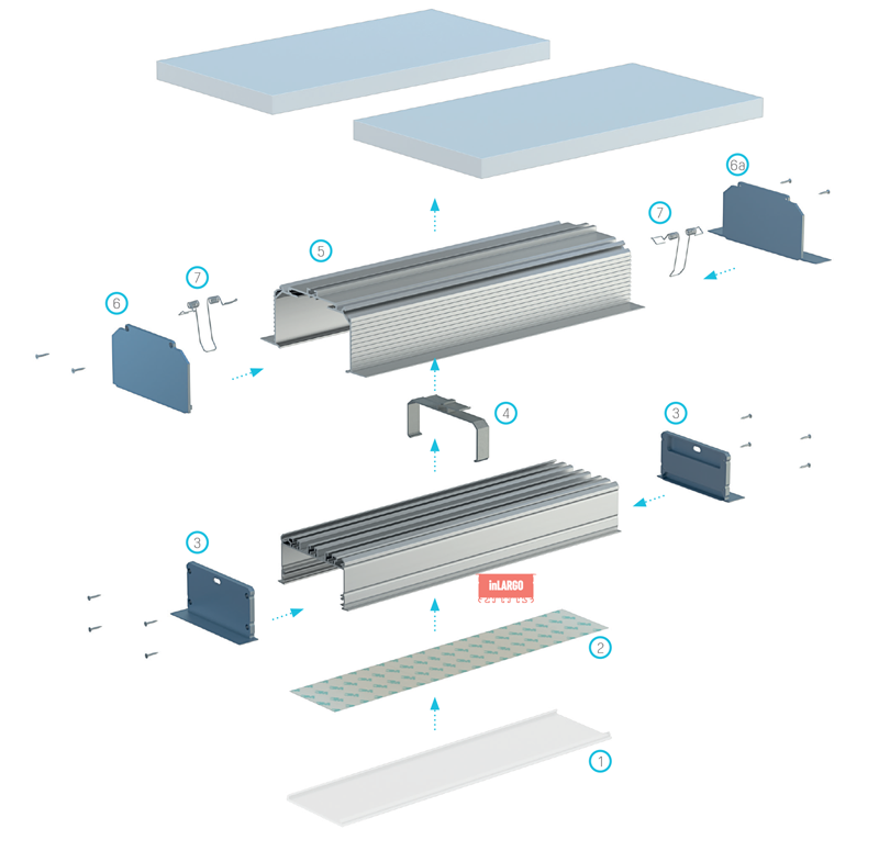 Schemat złożenia elementów systemu oświetleniowego w suficie z wykorzystaniem profilu inLARGO (1) klosza SUPER WIDE, (2) taśm LED, (3) zaślepek inLARGO z otworem, (4) łącznika międzyprofilowego LARGO, (5) profilu montażowego LARGO M3, (6) zaślepki LARGO M3 z wykończeniem prostym, (6a) zaślepki LARGO M3 z wykończeniem pełnym, (7) sprężyn montażowych.