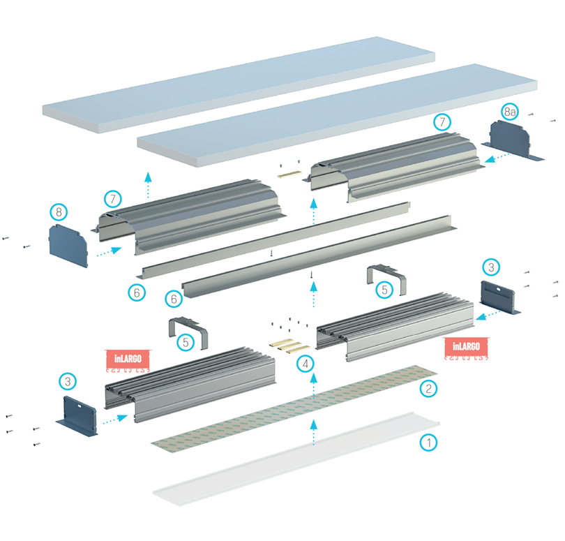 Schemat złożenia elementów systemu oświetleniowego w suficie z wykorzystaniem profilu inLARGO (1) klosza SUPER WIDE, (2) taśm LED, (3) zaślepek inLARGO z otworem, (4) łączników prostych, (5) łączników międzyprofilowych LARGO, (6) profili pomocniczych ROSET, (7) profili montażowych LARGO M4, (8) zaślepki LARGO M4 z wykończeniem prostym, (8a) zaślepki LARGO M4 z wykończeniem pełnym.