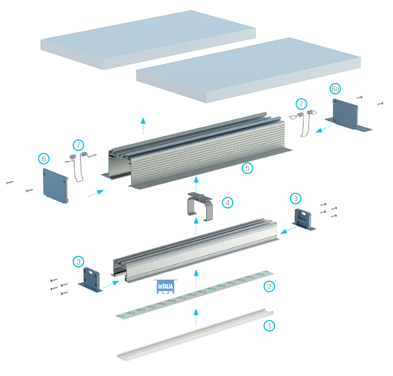 Schemat złożenia elementów systemu oświetleniowego w suficie z wykorzystaniem profilu inTALIA, (1) klosza DOUBLE, (2) taśm LED, (3) zaślepek z otworami (4) łącznika międzyprofilowego TALIA, (5) profilu montażowego TALIA M3, (6) zaślepki TALIA M3 z wykończeniem prostym, (6a) zaślepki TALIA M3 z wykończeniem pełnym, (7) sprężyn montażowych