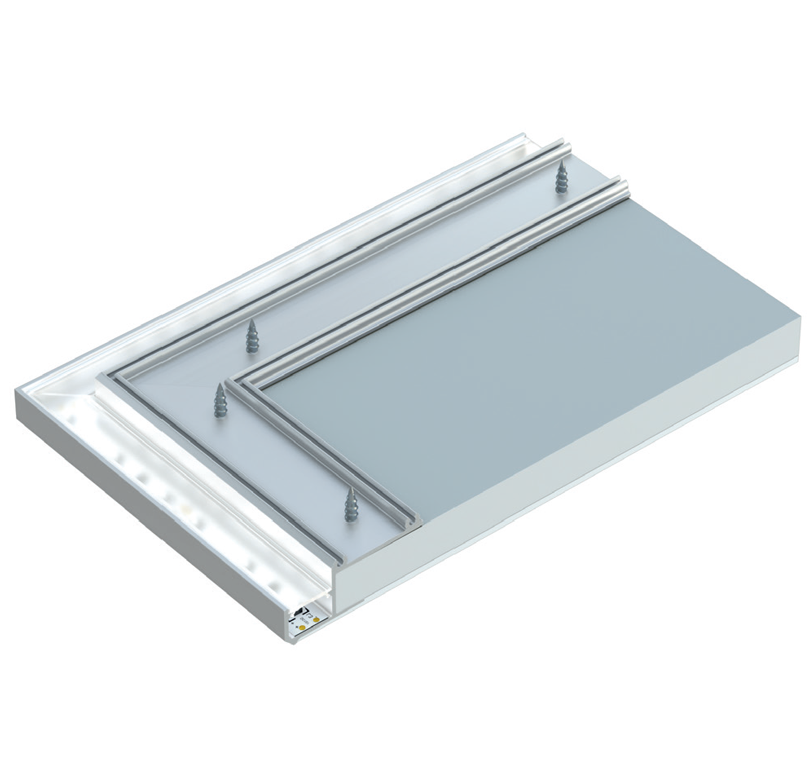 Efekt końcowy montażu profilu przeznaczonego do montażu sufitowego IPA12/16 z kloszem BASIC z zagipsowanym fragmentem profilu.