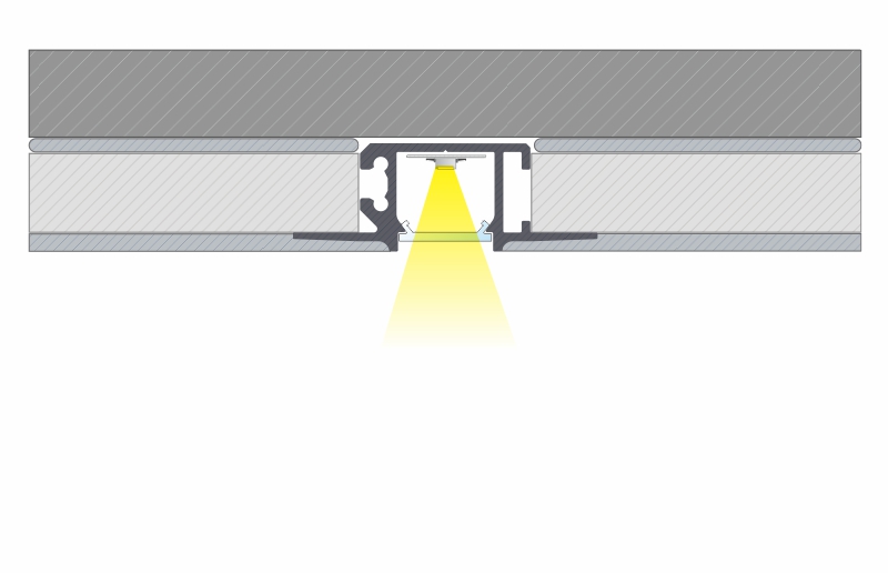 Efekt końcowy montażu profilu MONO z kloszem BASIC wpuszczonego pomiędzy płytami, a następnie zagipsowanegoA