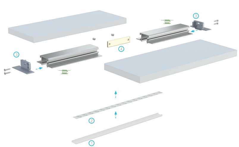 Schemat złożenia elementów systemu oświetleniowego w zabudowie z wykorzystaniem profilu MONO (1) klosza BASIC, (2) taśm LED, (3) zaślepek MONO z otworem, (4) łącznika prostego