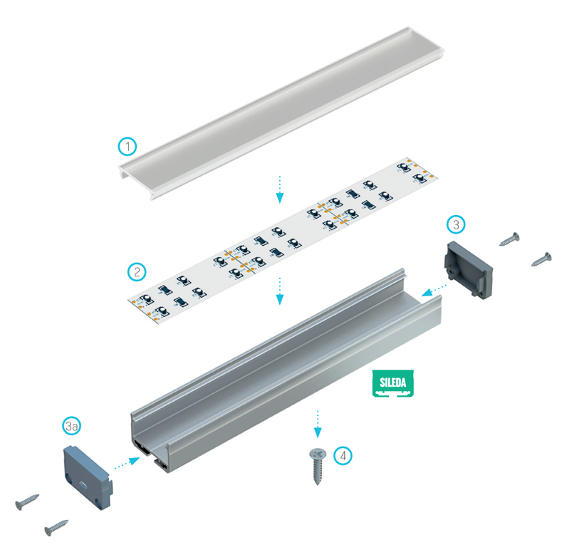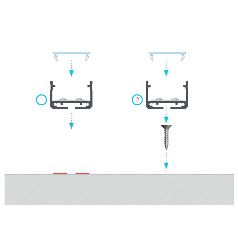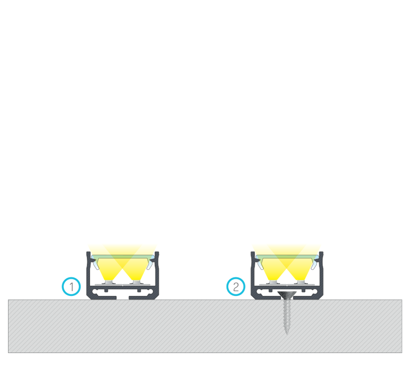 Efekt końcowy montażu profilu SILEDA z kloszem DOUBLE z wykorzystaniem (1) taśmy dwustronnej, (2) wkrętu montażowego