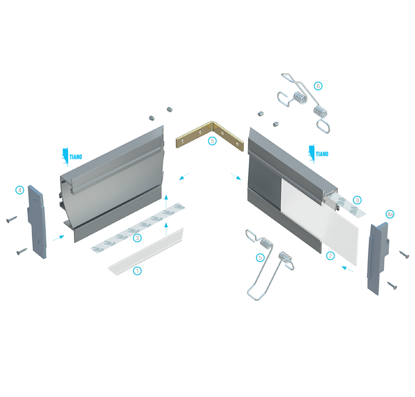 Schemat złożenia elementów systemu oświetleniowego z wykorzystaniem profilu TIANO (1) klosza BASIC, (2) osłony PLEXI TIANO, (3) taśmy LED, (4) zaślepki TIANO z wykończeniem prostym, (4a) zaślepki TIANO z wykończeniem pełnym, (5) łącznika kątowego poprzecznego, (6) sprężyn montażowych.