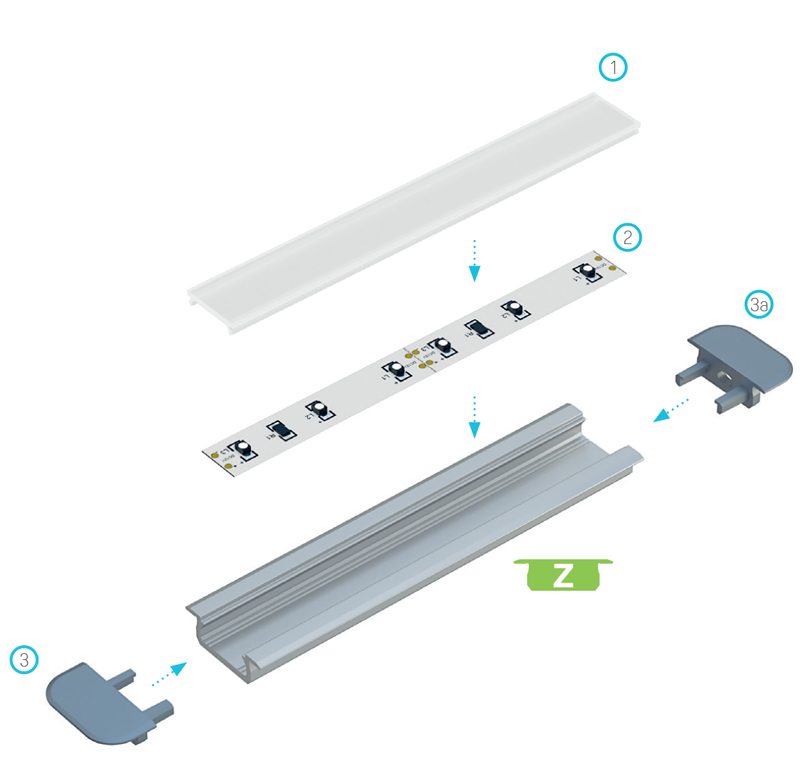 Schemat złożenia elementów systemu oświetleniowego z wykorzystaniem profilu Z wpuszczanego oraz (1) klosza BASIC, (2) taśmy LED, (3) zaślepek z otworami