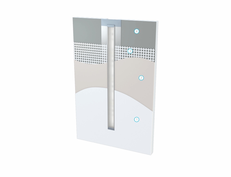 Etapy montażu z wykorzystaniem profilu MONO w zabudowie [1.farba, 2.gips, 3. siatka, 4. płyta karton-gipsowa]
