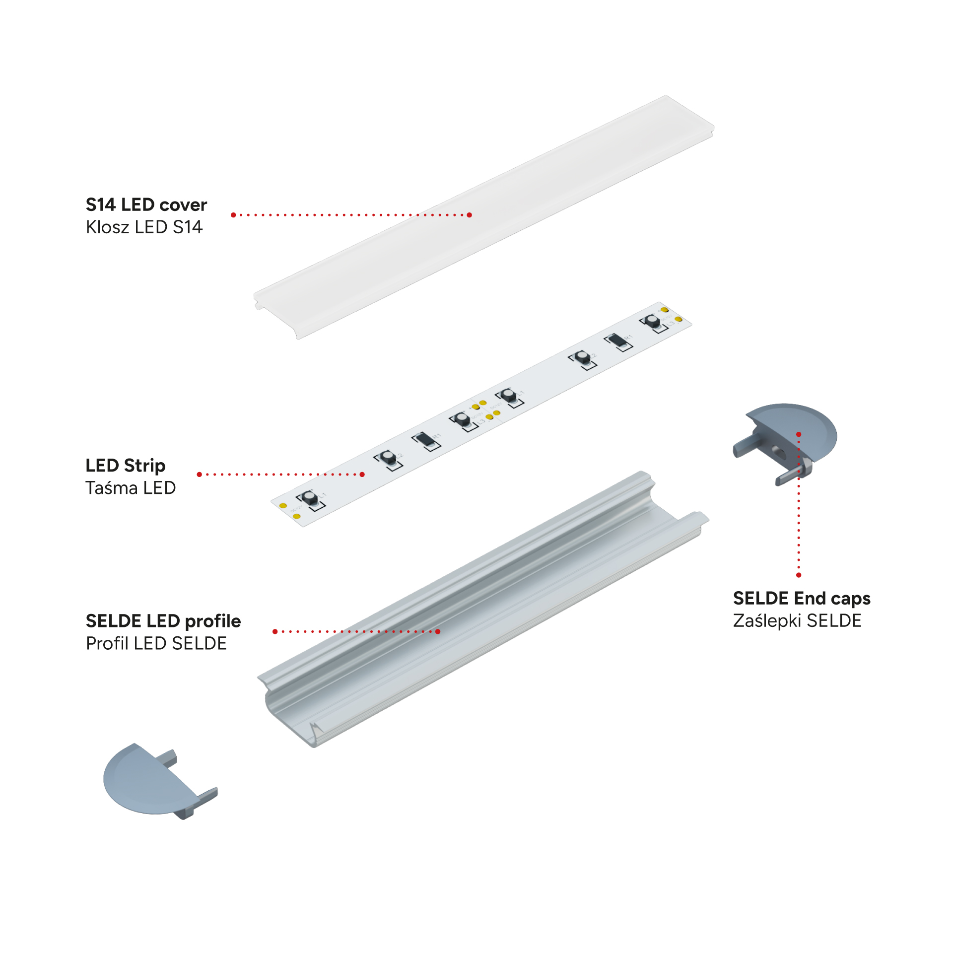 Zestaw zawiera: 1 x Profil LED SELDE, 1 x Klosz LED S14, 4 x Zaślepka SELDE