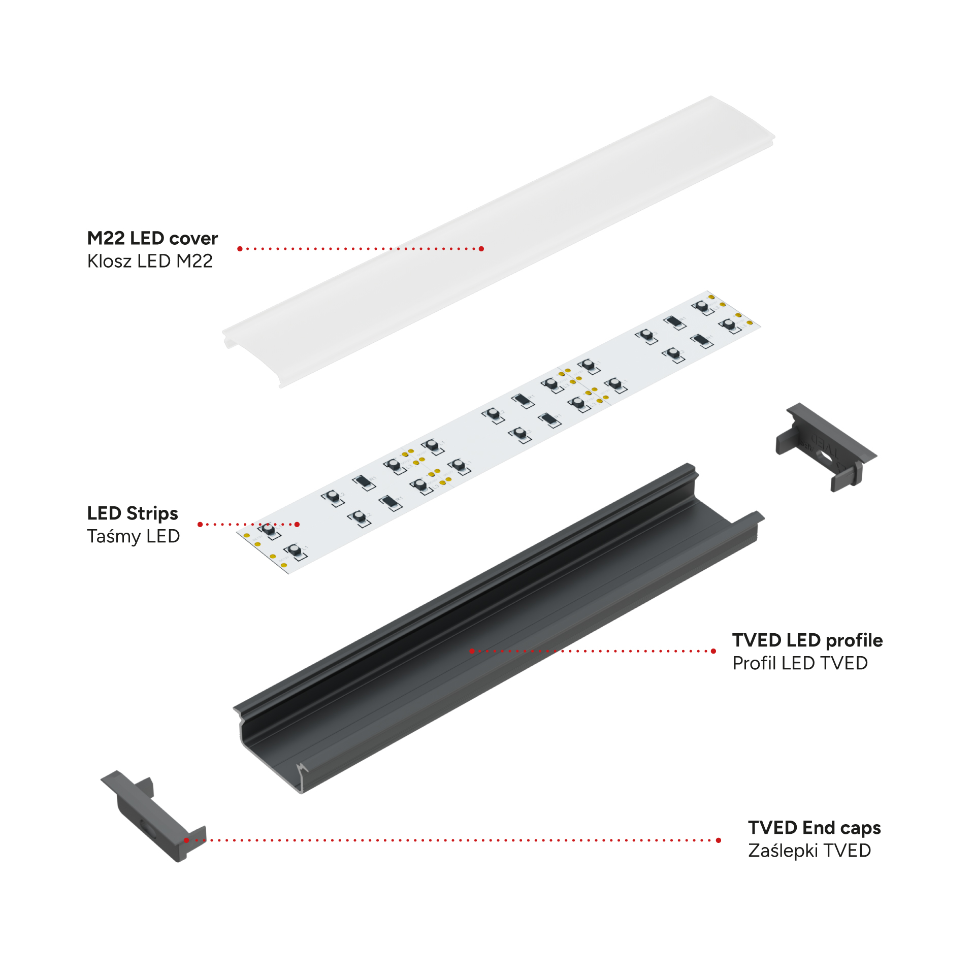 Zestaw zawiera: 1 x Profil LED TVED, 1 x Klosz LED M22, 4 x Zaślepka TVED