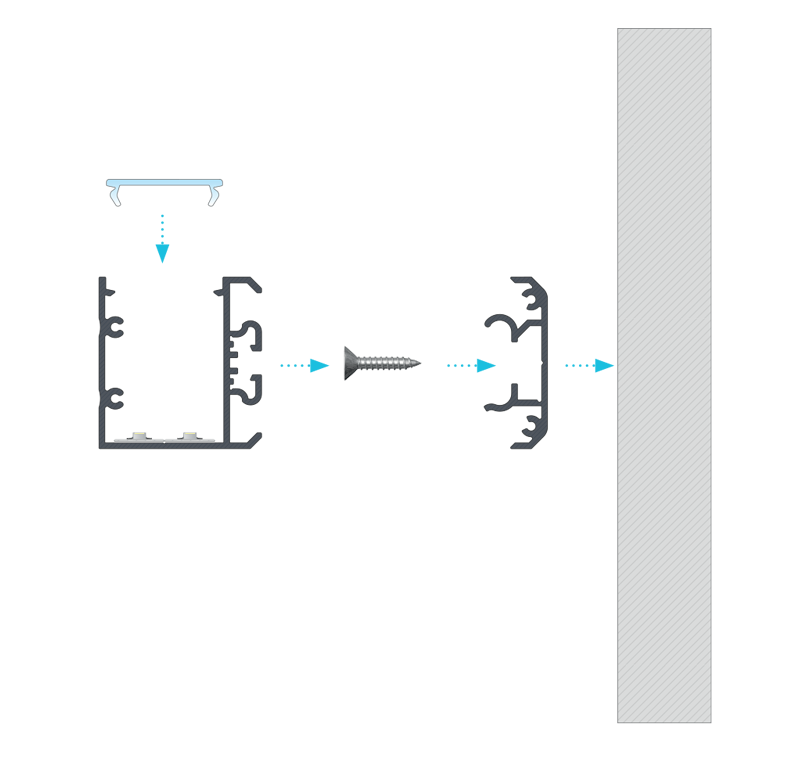 Montaż profilu UNICO z kloszem DOUBLE z wykorzystaniem wkrętu montażowego oraz profilu montażowego TALIA M1 oraz efekt końcowy.