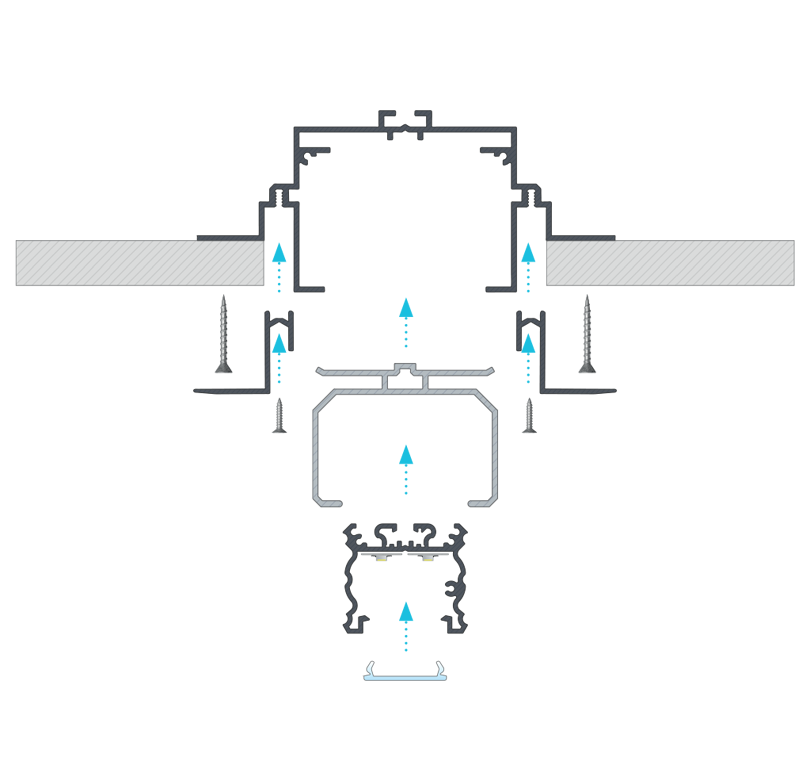 Zasada montażu systemu profilu LARGO z kloszem SUPER WIDE z wykorzystaniem profilu montażowego LARGO M4, łącznika międzyprofilowego LARGO oraz profilu pomocniczego ROSET