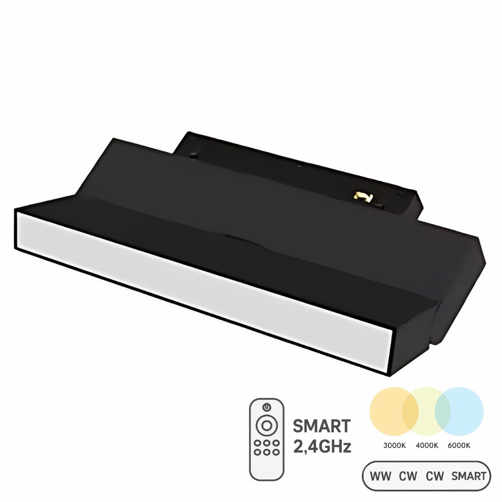 Reflektor magnetyczny mleczny czarny z serii CCT Switch o mocy 12W i długości 22 cm. Lampa z przełącznikiem na obudowie umożliwiającym zmianę barwy światła (3000K, 4000K, 6000K), a także możliwością sterowania za pomocą pilota radiowego 2,4 GHz.