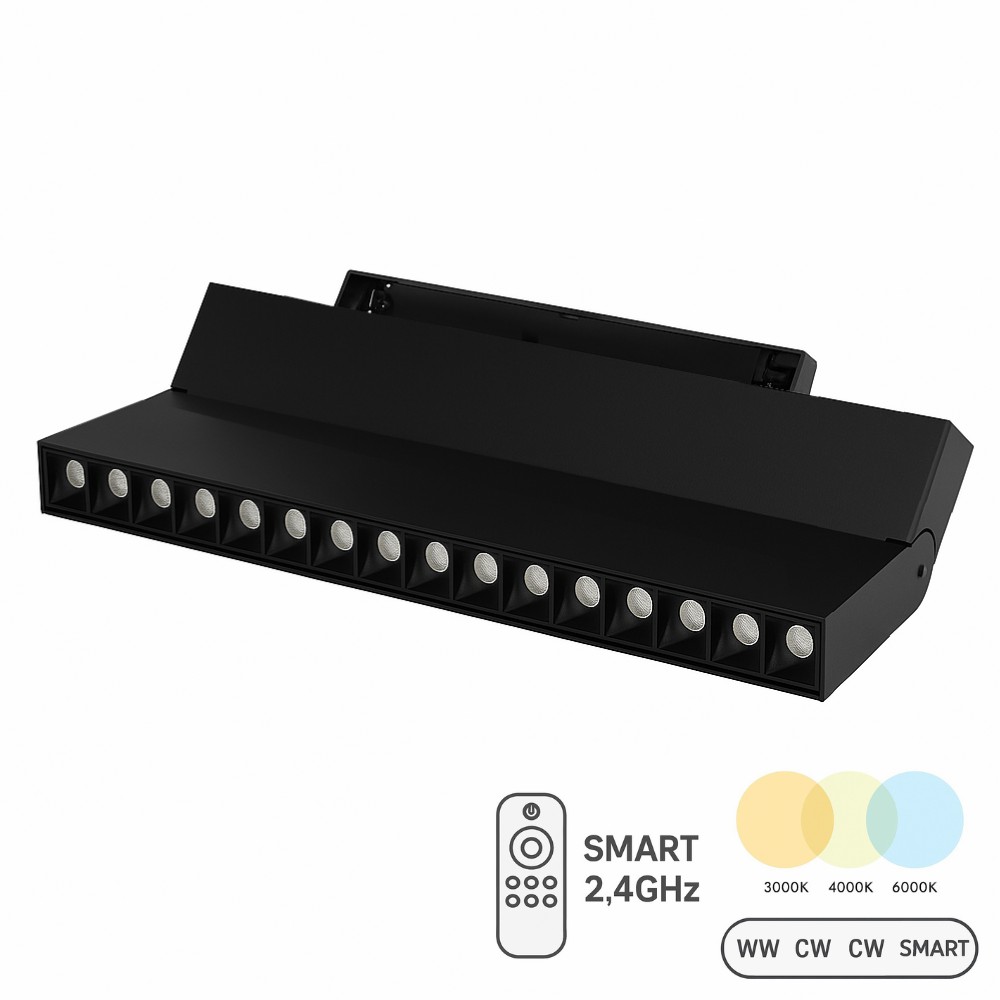 Reflektor magnetyczny punktowy czarny z serii CCT Switch o mocy 18W i długości 33 cm. Lampa z przełącznikiem na obudowie umożliwiającym zmianę barwy światła (3000K, 4000K, 6000K), a także możliwością sterowania za pomocą pilota radiowego 2,4 GHz.