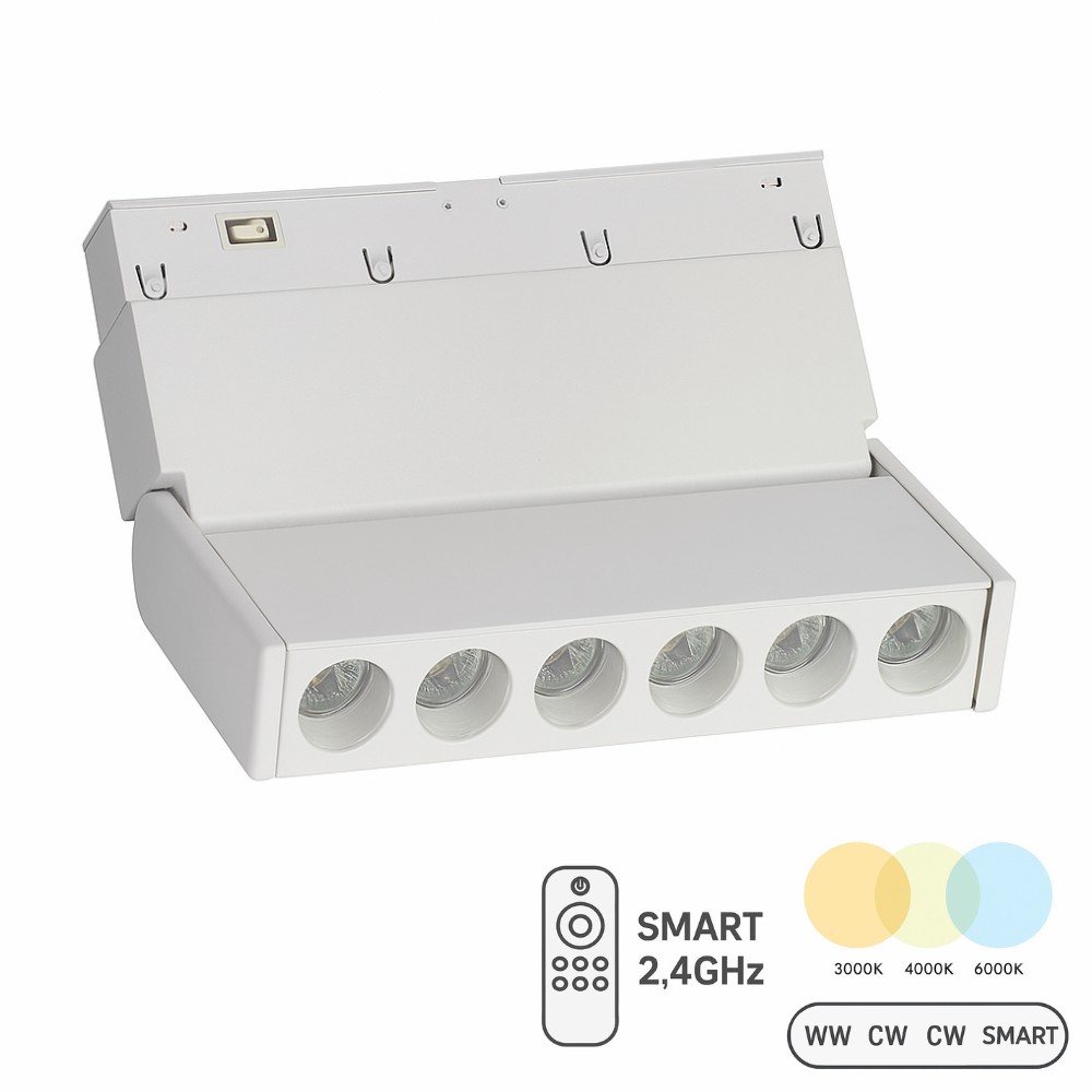 Reflektor magnetyczny punktowy biały z serii CCT Switch o mocy 6W i długości 11 cm. Lampa z przełącznikiem na obudowie umożliwiającym zmianę barwy światła (3000K, 4000K, 6000K), a także możliwością sterowania za pomocą pilota radiowego 2,4 GHz.