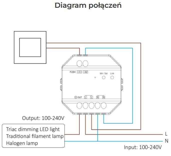 Ściemniacz TRI-C1WR został zaprojektowany do współpracy z instalacjami oświetleniowymi zasilanymi napięciem sieciowym 100–240V AC. To rozwiązanie przeznaczone do źródeł światła, które obsługują ściemnianie w technologii triakowej i nie wymagają osobnego zasilacza LED niskonapięciowego.
