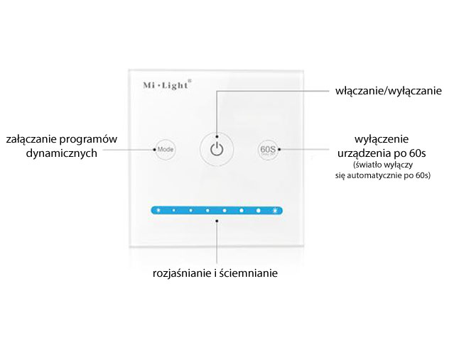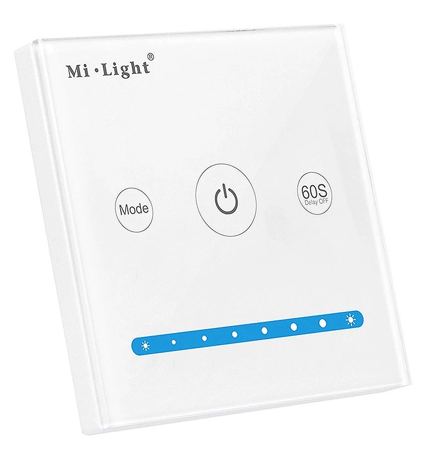 Kontroler dotykowy MiLight P1 wyposażony został w czuły ekran dotykowy wykonany szkła hartowanego i może pełnić funkcję standardowego włącznika światła z dodatkową możliwością jego płynnego ściemniania. Sterownik MiLight P1 został wyposażony także w aż 9 automatycznych efektów. Są to: