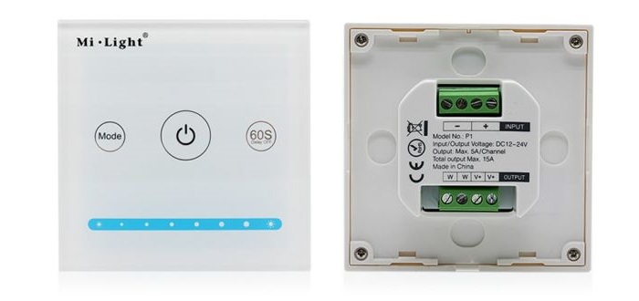 Sterownik naścienny MiLight P1 to kontroler przeznaczony do sterowania jednokolorowymi taśmami LED. Urządzenie umożliwia nam płynną regulację jasności światła białego, a także posiada funkcje automatycznego wyłączenia światła po okresie 60 sekund. Sterownik Mi-Light P1 podłączamy do zasilania 12V-24V DC między zasilaczem a sterowaną taśmą LED. Nasze urządzenie jest w stanie obsłużyć aż 180W LED 12V lub 360W LED 24V ale należy pamiętać, że maksymalna moc podłączonego źródła światła nie może przekroczyć 6A na kanał. Ściemniacz MiLight P1 przeznaczony jest do montażu w standardowej puszce instalacyjnej FI60mm