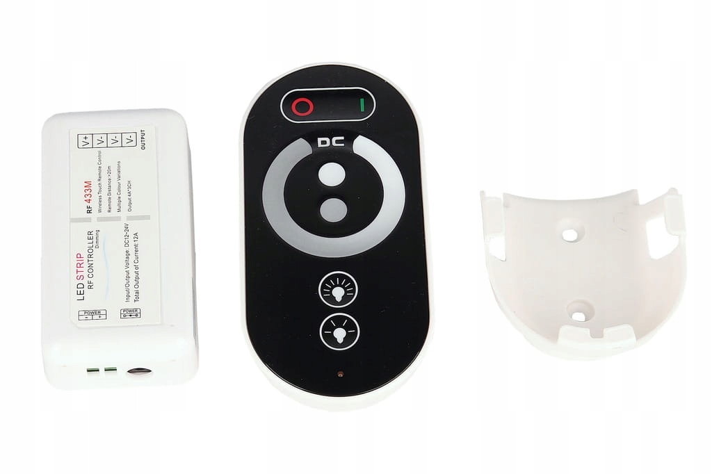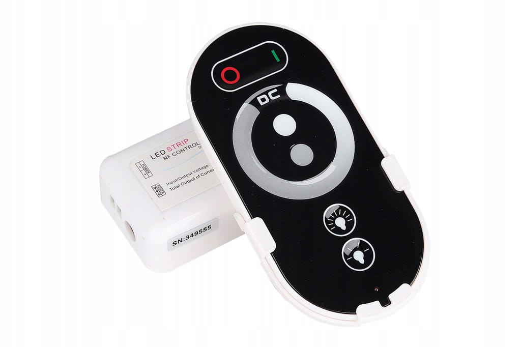 Ściemniacz do taśmy LED 12V/24V z pilotem dotykowym i uchwytem przeznaczony do instalacji oświetleniowych o mocy 144W. Bezprzewodowe sterowanie radiowe.