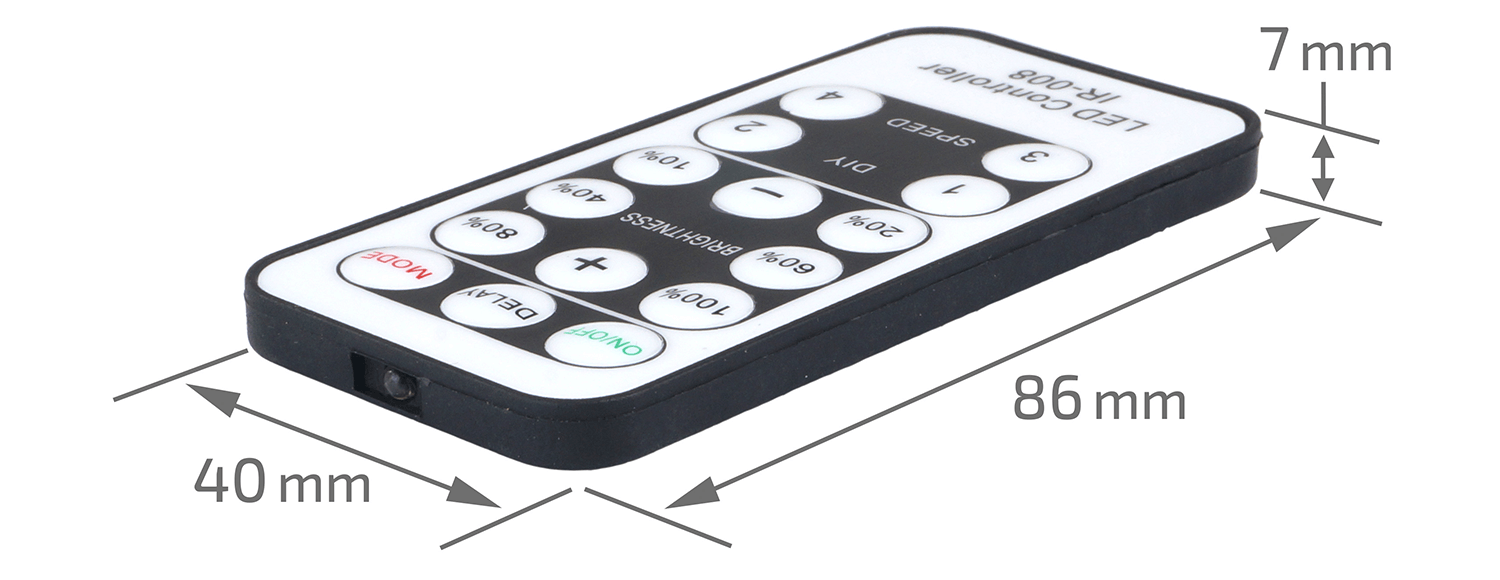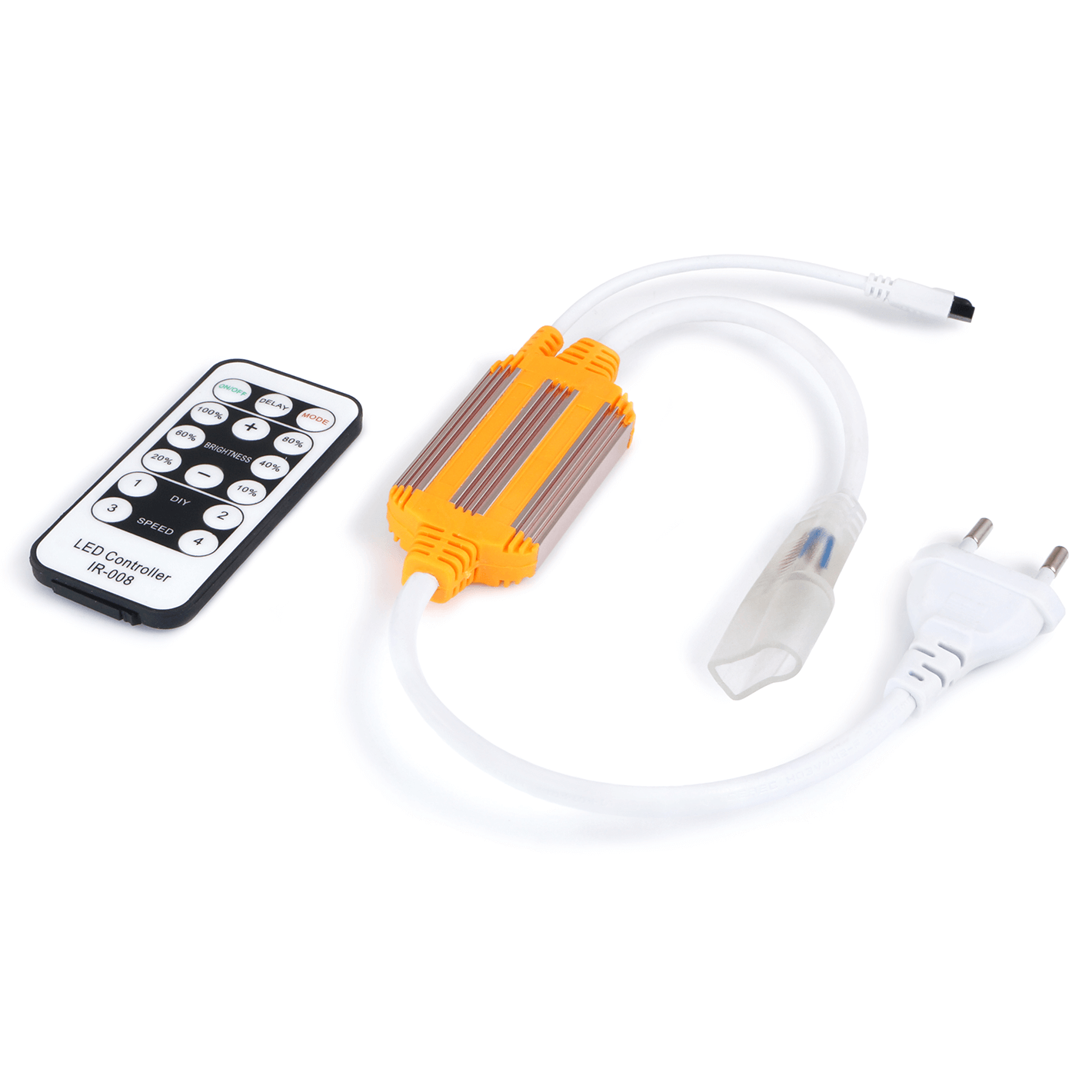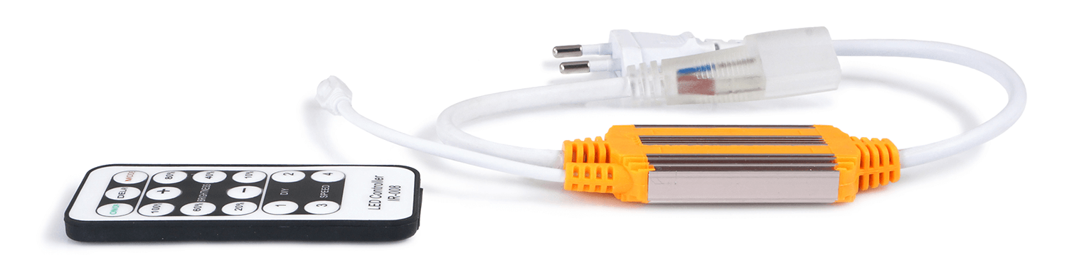 Ściemniacz 230V z pilotem i stabilizatorem napięcia, przeznaczony do sterowania jednokolorowymi neonami 8×16 230V. Kontroler w komplecie z przewodem przyłączeniowym i wtyczką do prądu.