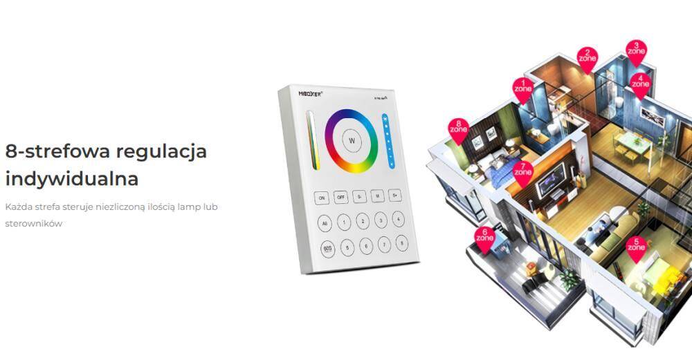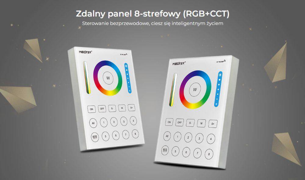 Panel Mi-Light B8 to uniwersalne urządzenie sterujące, które współpracuje z kompatybilnymi sterownikami i instalacjami LED systemu Mi-Light/MiBoxer: