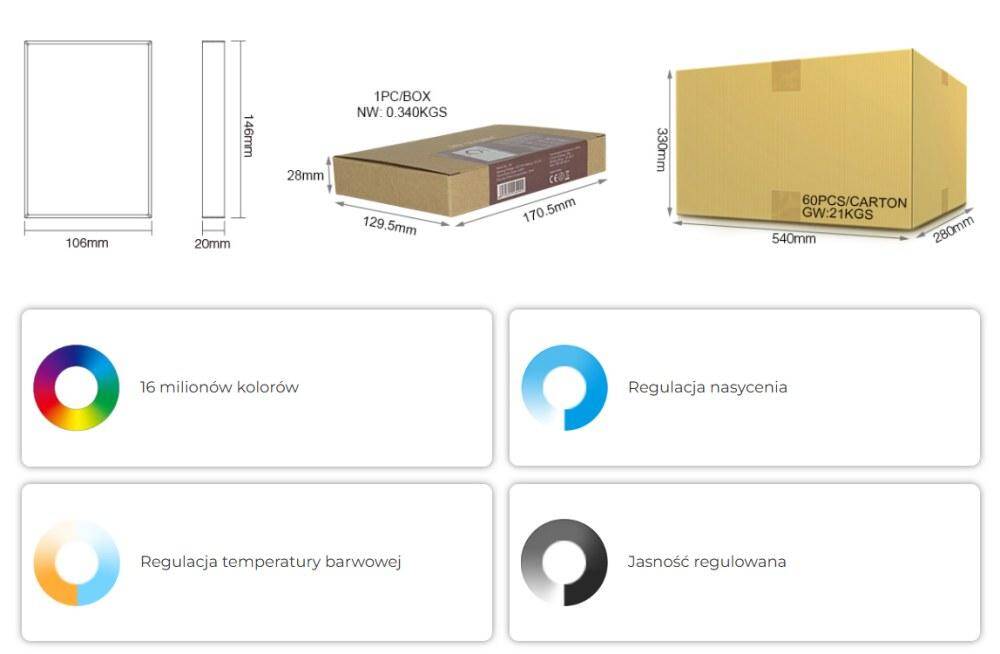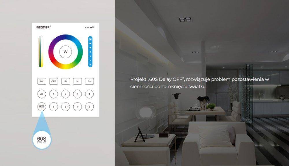 Panel B8 służy do wygodnej obsługi nowoczesnych instalacji oświetleniowych LED opartych na systemie Mi-Light/MiBoxer. Umożliwia sterowanie urządzeniami i źródłami światła RGB+CCT. Za pomocą panelu można zmieniać kolor światła, regulować jego nasycenie, dostosowywać temperaturę barwową bieli oraz płynnie zmieniać jasność. Dotykowy panel pozwala szybko dopasować ustawienia oświetlenia do aktualnych potrzeb użytkownika i wygodnie sterować wybranymi strefami.